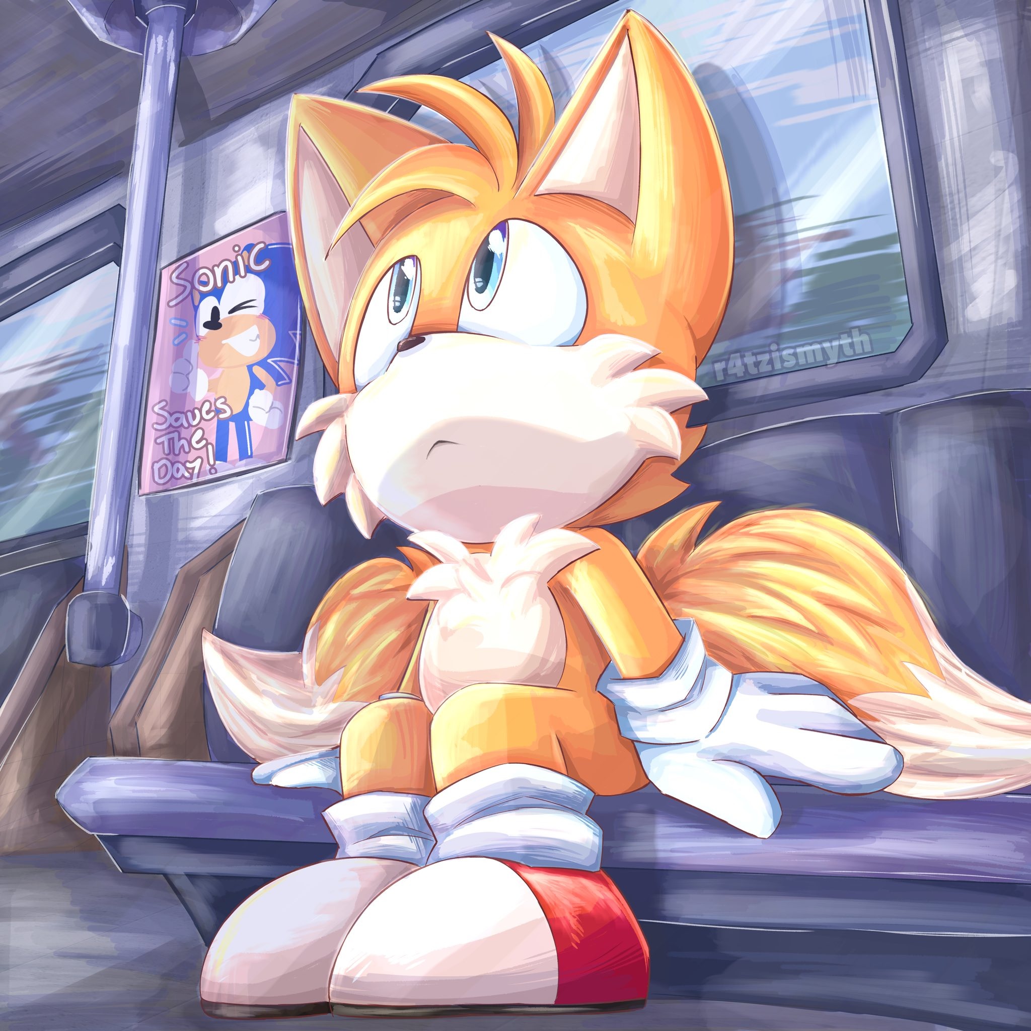 1boy ad animal_ears blonde_hair blue_eyes child fox_boy fox_ears fox_tail furry furry_male gloves highres looking_up multiple_tails petite sega shoes sitting socks solo sonic_(series) sonic_adventure sonic_the_hedgehog tail tails_(sonic) train train_interior two_tails yellow_fur