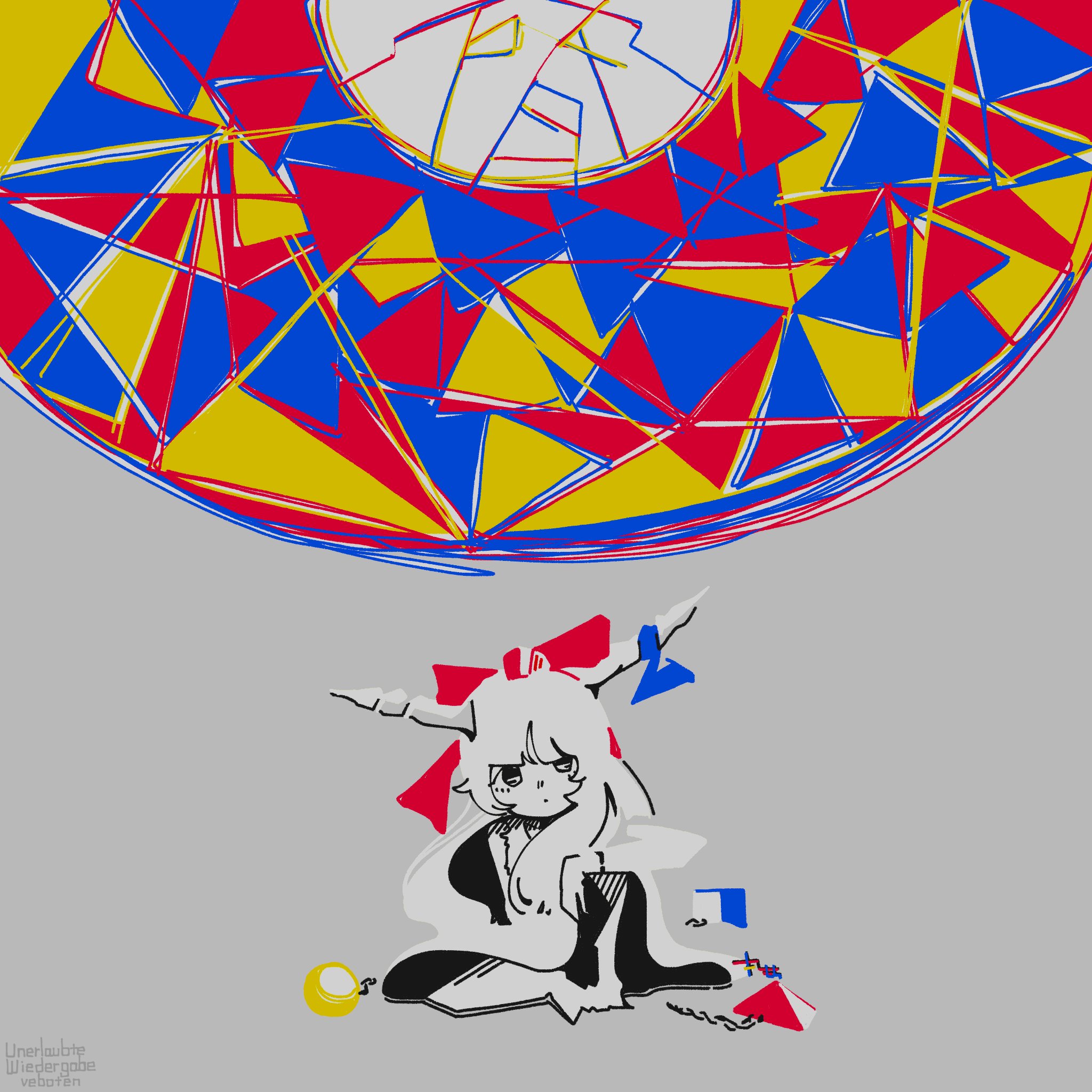 1girl 3ma_can_omochi abstract abstract_background arm_on_own_leg arm_rest blue_ribbon bow commentary_request cube expressionless full_body grey_background hair_bow highres horn_ornament horn_ribbon horns ibuki_suika knee_up limited_palette long_hair looking_at_viewer muted_color orb pyramid_(geometry) red_bow ribbon sitting solo spot_color straight-on touhou wide_shot