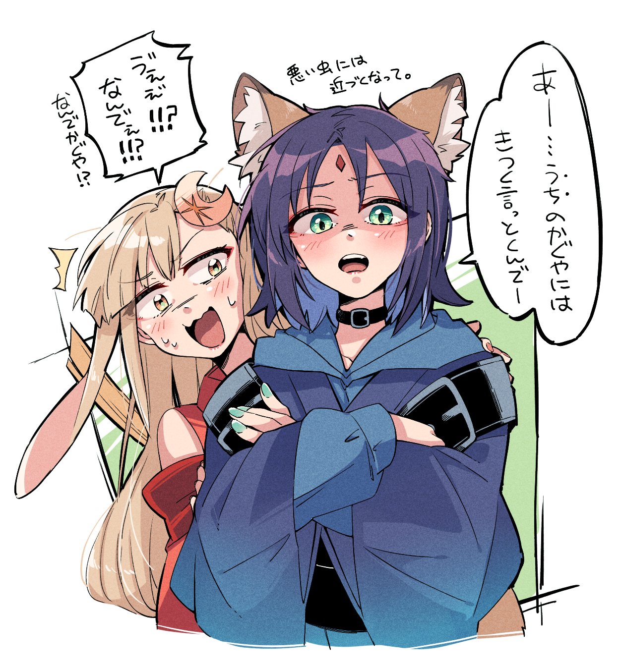2girls animal_ears bbr_brbr behind_another blonde_hair blue_hair blue_hoodie blue_kimono cho_kaguya-hime! colored_inner_hair commentary crescent crescent_hair_ornament crossed_arms forehead_jewel fox_ears green_background green_eyes hair_ornament highres hood hood_down hoodie japanese_clothes kaguya_(cho_kaguya-hime!) kimono long_hair long_sleeves looking_at_viewer lop_rabbit_ears medium_hair multicolored_hair multiple_girls nervous_sweating open_mouth purple_hair rabbit_ears red_kimono sakayori_iroha shaded_face speech_bubble straight_hair sweat teeth translation_request upper_teeth_only wavy_mouth yellow_eyes