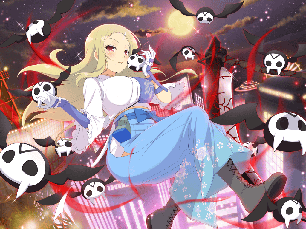 1girl animal armor bat_(animal) belt_pouch blonde_hair blue_hakama blush boots breasts building city city_lights clothing_cutout energy floral_print_hakama frilled_kimono frills full_moon gessen_academy_school_uniform gloves hair_ornament hairclip hakama heart heart-shaped_eyes hip_vent holding holding_animal horizon japanese_armor japanese_clothes kimono kote large_breasts light_particles long_hair looking_at_viewer midair middle_part mole mole_under_mouth moon mountain mountainous_horizon muneate night official_art parted_bangs pouch red_eyes school_emblem school_uniform scythe seductive_smile senran_kagura senran_kagura_new_link senran_kagura_shinovi_versus shiki_(senran_kagura) ship sky skyscraper smile solo star_(sky) starry_sky tower water watercraft white_gloves white_kimono yacht