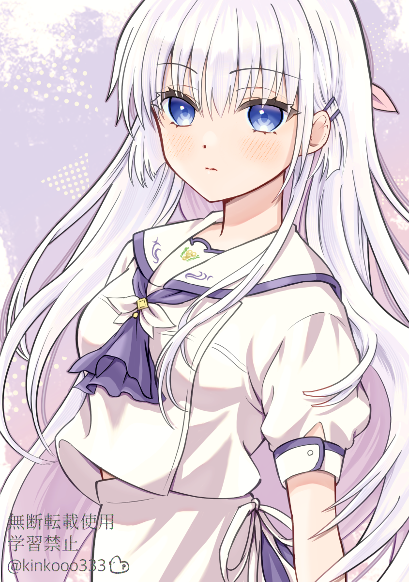 1girl 3: arms_at_sides ascot black_ascot blue_eyes blunt_ends blush closed_mouth commentary cowboy_shot expressionless eyelashes eyes_visible_through_hair floating_hair grey_background hair_behind_ear hair_between_eyes highres long_hair looking_at_viewer naruse_shiroha piyo_(kinkooo333) puffy_short_sleeves puffy_sleeves ribbon sailor_collar school_uniform serafuku shirt short_sleeves sidelocks simple_background skirt solo split_mouth straight_hair summer_pockets summer_pockets_school_uniform tsurime twitter_username very_long_hair white_hair white_ribbon white_sailor_collar white_shirt white_skirt