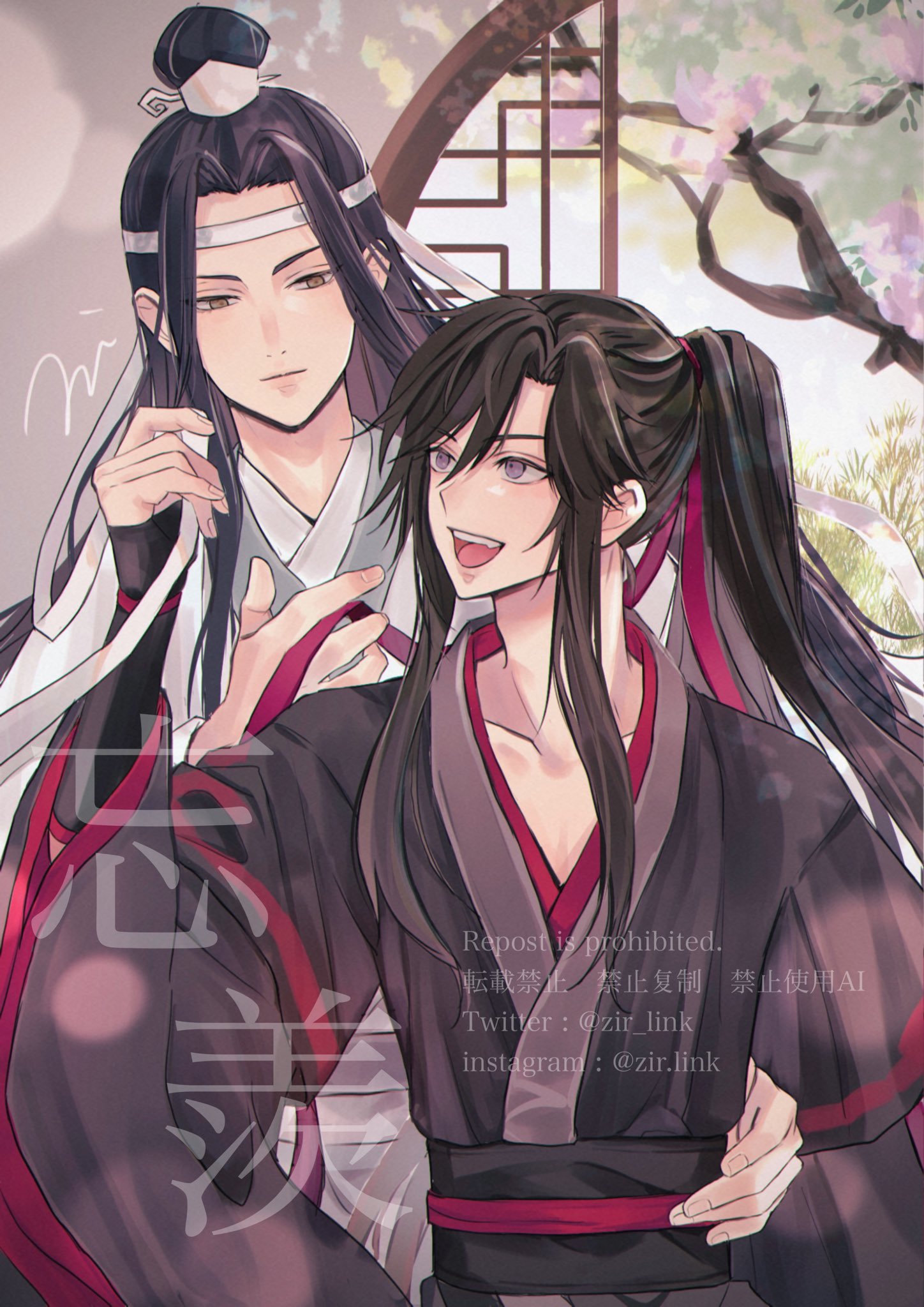 2boys :d artist_name bishounen black_hair black_hanfu black_sash chinese_clothes chinese_text closed_mouth commentary_request couple flower grass hair_ribbon hand_on_another's_hip hand_up hanfu headband height_difference high_ponytail highres holding holding_ribbon indoors lan_wangji lattice leaf long_hair long_sleeves looking_at_another looking_at_viewer male_focus modao_zushi multiple_boys open_mouth ponytail purple_eyes red_ribbon red_sash ribbon robe round_window sash sidelocks sleeves_past_wrists smile teeth topknot tree twitter_username upper_body watermark wei_wuxian white_hanfu white_headband wide_sleeves window xiao_guan_(headdress) yaoi yellow_eyes zir_link