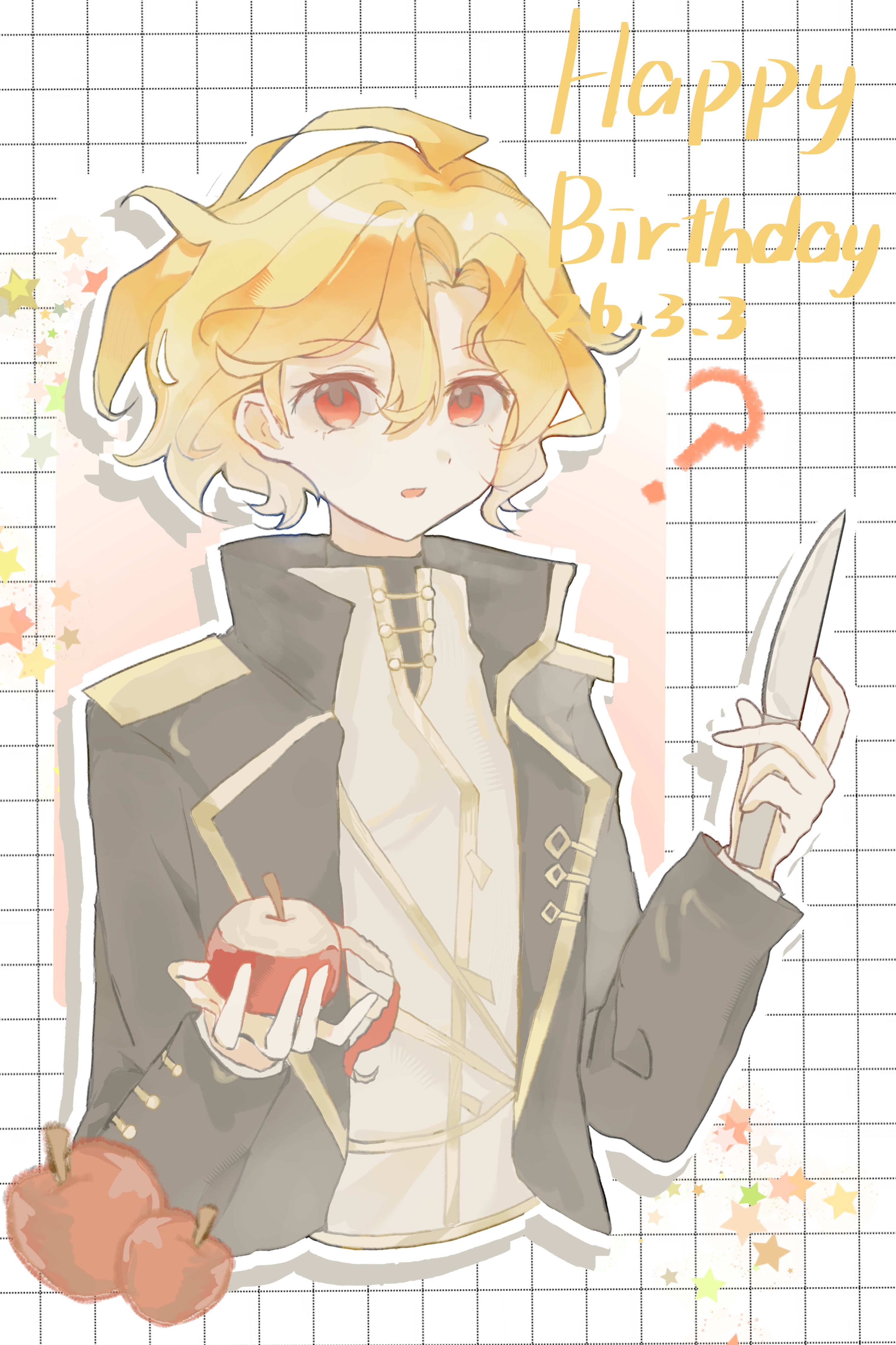1girl ? absurdres apple birthday black_jacket blonde_hair chinese_commentary coat commentary_request cropped_torso dated don_quixote_(project_moon) food fruit gold_trim grid_background hair_between_eyes happy_birthday highres holding holding_food holding_fruit holding_knife jacket knife limbus_company long_sleeves looking_at_viewer open_clothes open_jacket open_mouth outline peeling project_moon red_eyes sancho_(project_moon) shirt short_hair solo star_(symbol) upper_body white_outline xunhuanshashou