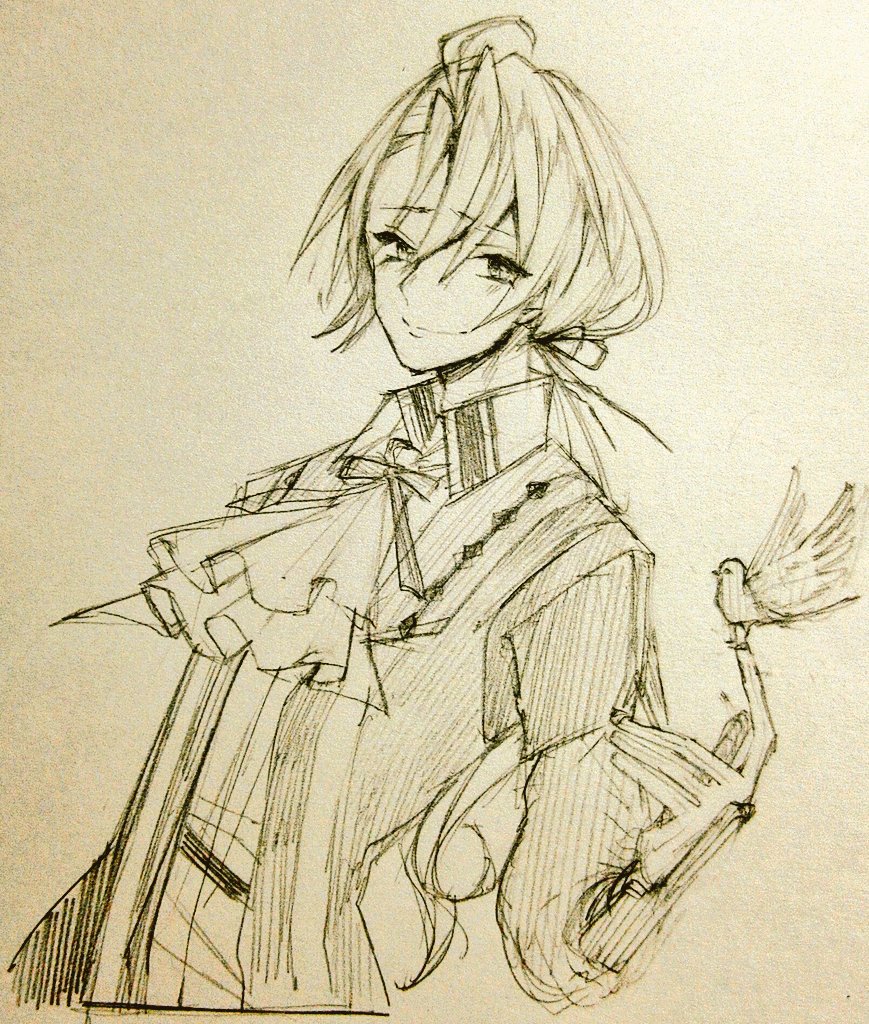 1boy ascot bird closed_mouth coat commentary_request gloves grimms_notes hair_between_eyes hair_ribbon hand_up long_hair looking_at_viewer low_ponytail male_focus monochrome parted_bangs ponytail ribbon romeo_(grimms_notes) romeo_(original)_(grimms_notes) shino_(5no) simple_background smile solo traditional_media upper_body