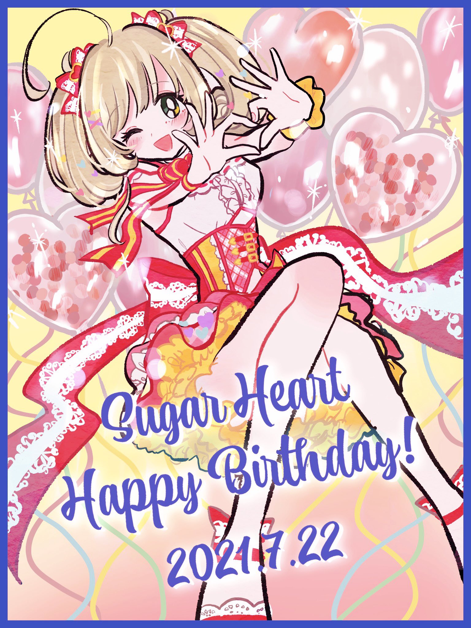 1girl ;d ahoge balloon breasts brown_hair center_frills commentary_request dated frills green_eyes happy_birthday heart heart_balloon heart_hands highres idolmaster idolmaster_cinderella_girls long_hair looking_at_viewer mocomocoooom one_eye_closed open_mouth outstretched_arms petticoat purple_background red_skirt sato_shin scrunchie shirt skirt smile solo twintails white_shirt wrist_scrunchie yellow_background