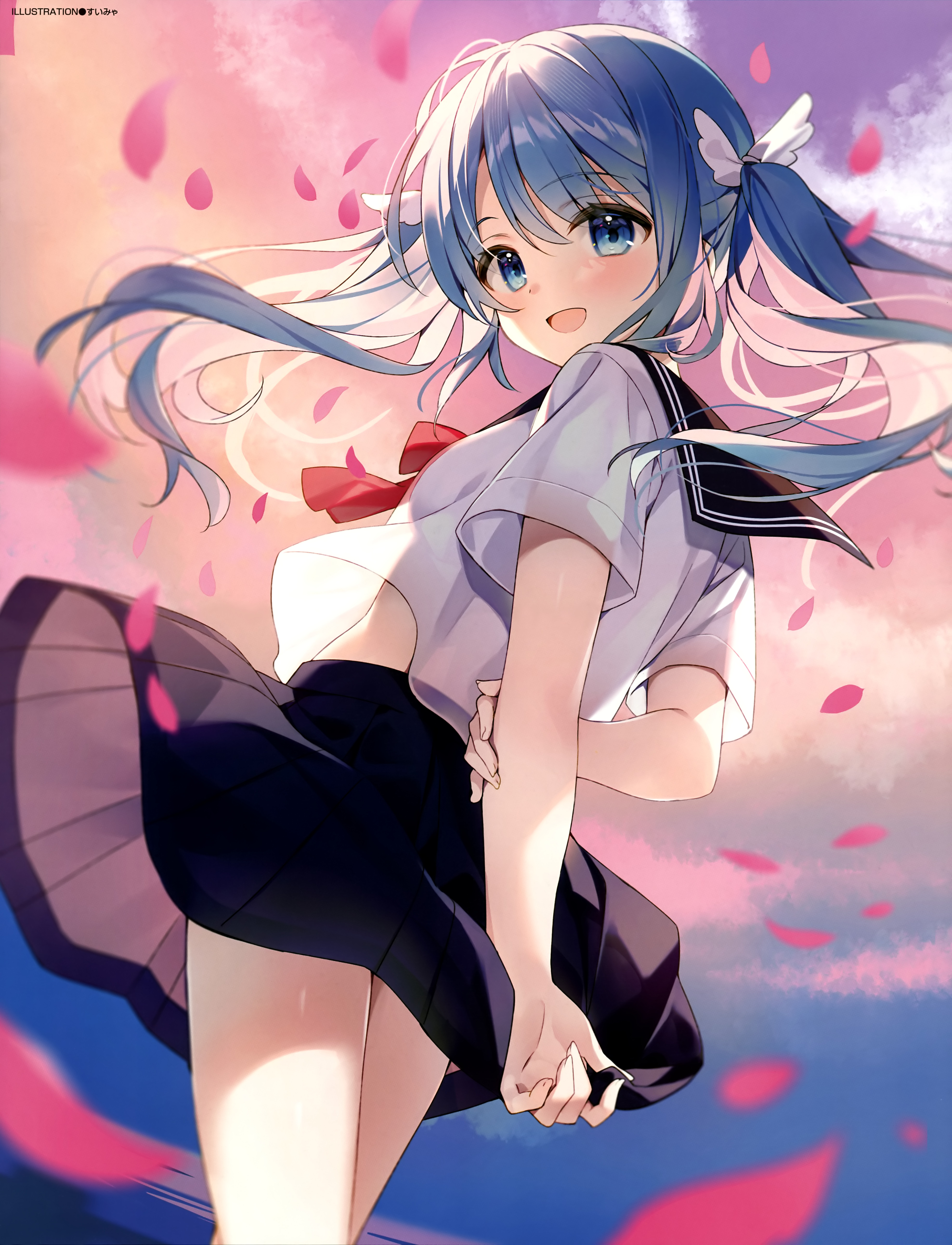 1girl :d absurdres arms_behind_back artist_name black_skirt blue_eyes blue_hair cloud cloudy_sky cowboy_shot dengeki_moeoh dutch_angle falling_petals floating_hair from_behind from_below hair_between_eyes hand_on_own_elbow highres light_blush long_hair looking_at_viewer looking_back magazine_scan neckerchief open_mouth original outdoors petals pink_petals pleated_skirt red_neckerchief scan school_uniform serafuku sesera_(suimya) shirt short_sleeves skirt sky smile solo suimya third-party_source twintails white_shirt
