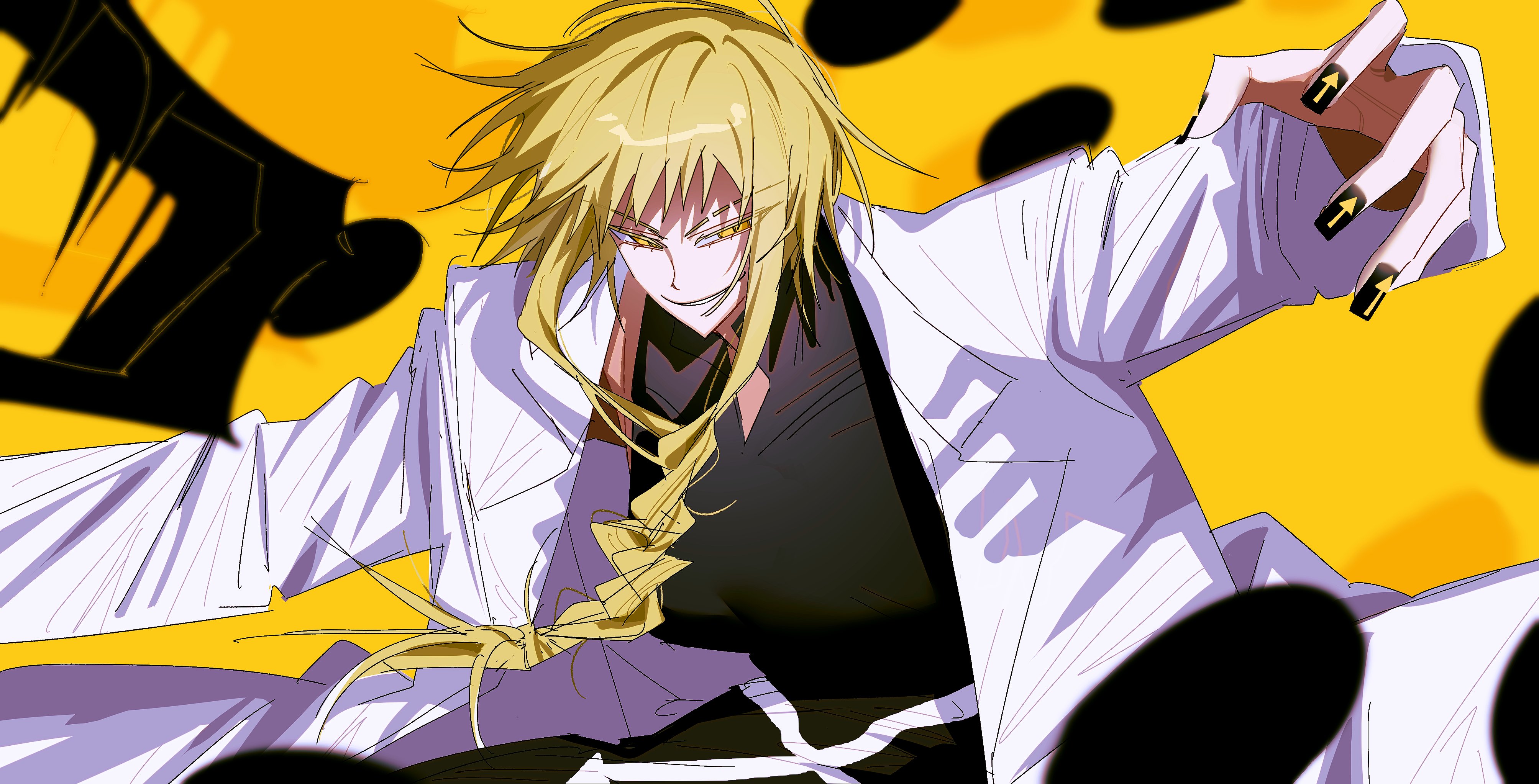 1girl absurdres black_dress black_nails blonde_hair braid breasts coat dress front_braid highres lab_coat large_breasts long_hair long_sleeves medusa_gorgon nail_art nail_polish se_4242564 slit_pupils smile smirk soul_eater white_coat yellow_background yellow_eyes
