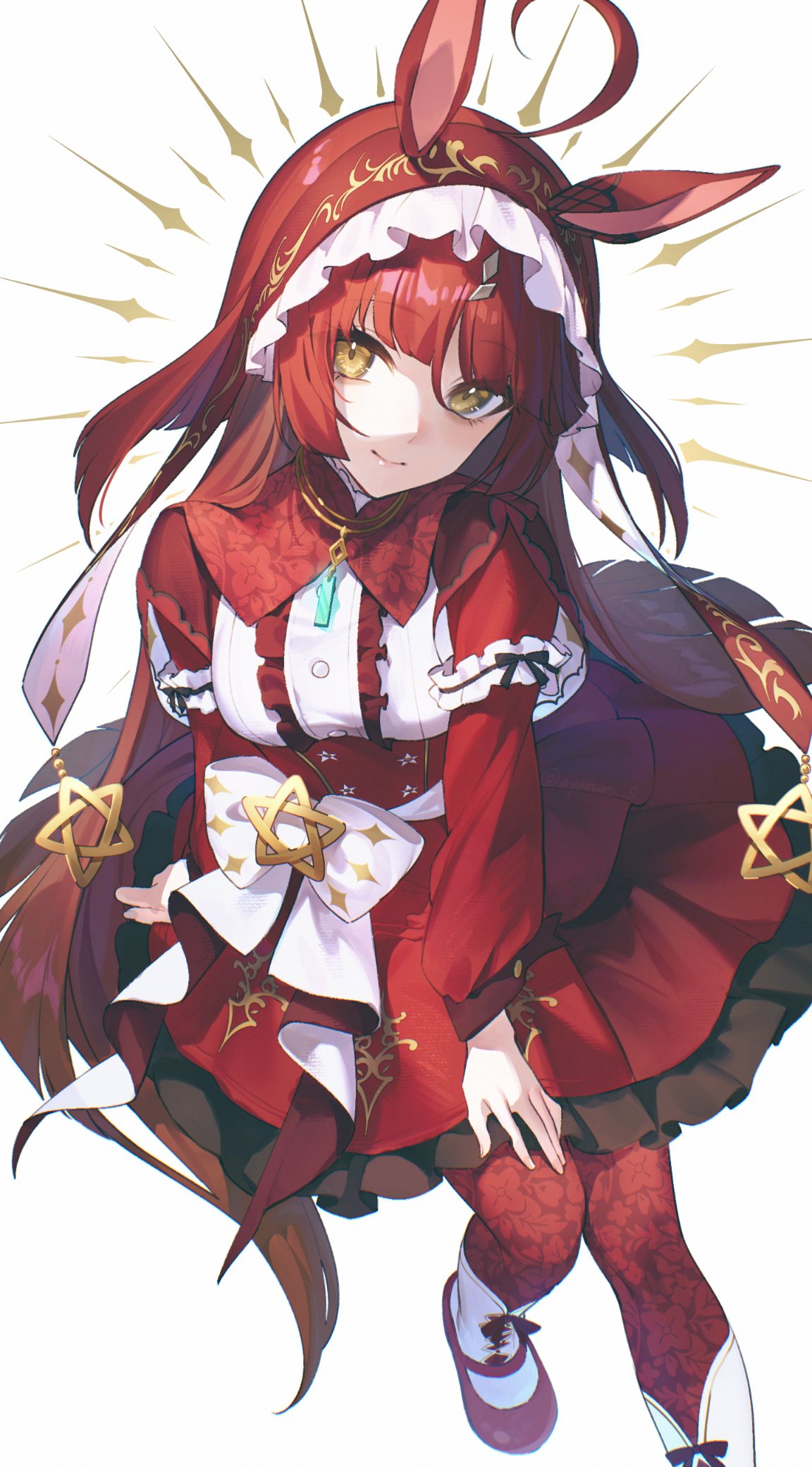 1girl ahoge animal_ears blush breasts commentary_request full_body hair_between_eyes hair_ornament hairband highres horse_ears horse_girl long_hair red_desire_(umamusume) red_hair ribbon saika_mogu small_breasts smile solo thighhighs umamusume white_background yellow_eyes