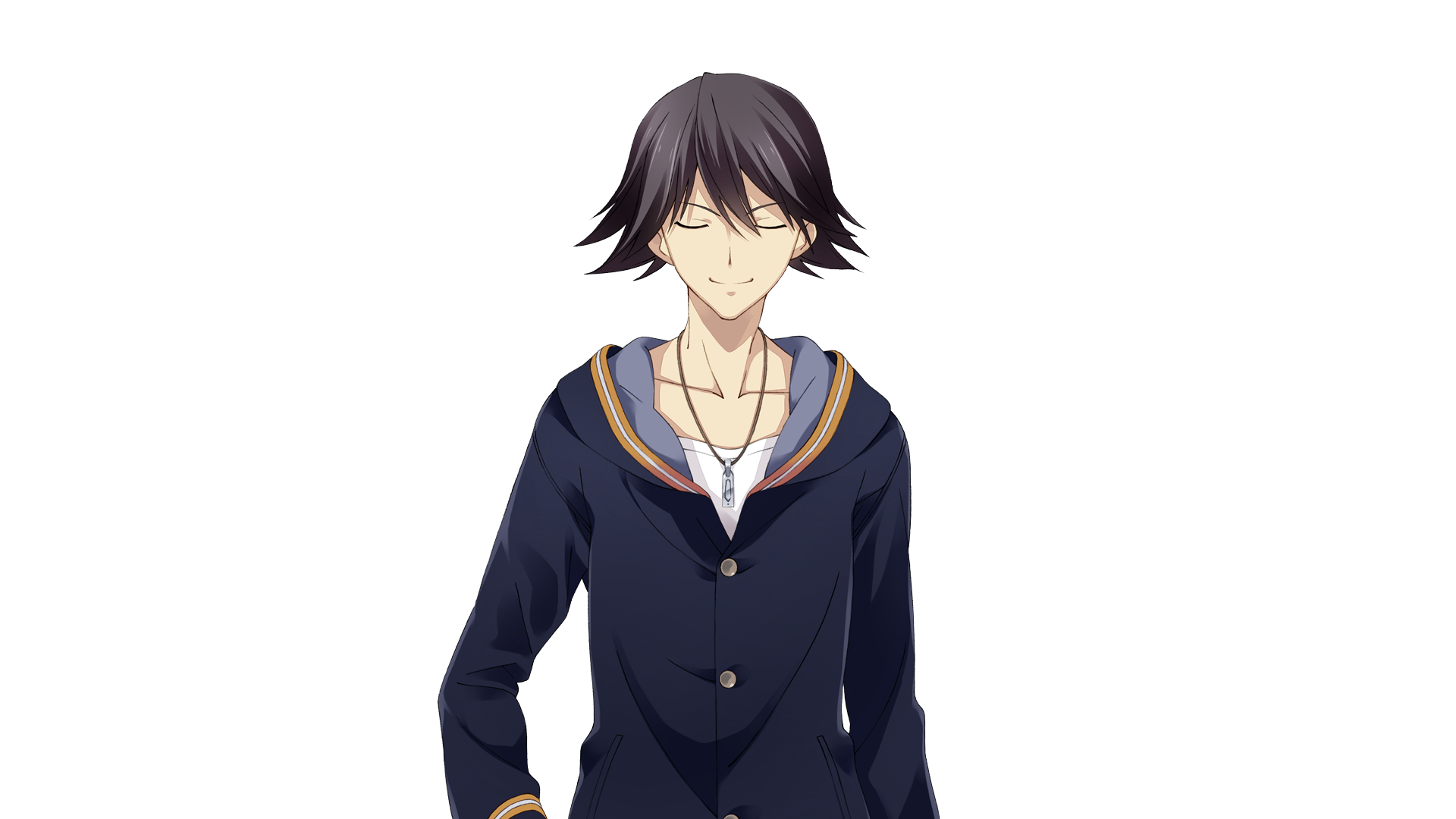 1boy black_hair blue_hoodie buttons casual chaos;child closed_eyes collarbone facing_viewer game_cg hand_on_own_hip highres hood hoodie itou_shinji_(chaos;child) jewelry long_sleeves male_focus matsuo_yukihiro necklace non-web_source official_art science_adventure shirt short_hair smile solo swept_bangs tachi-e transparent_background upper_body white_shirt