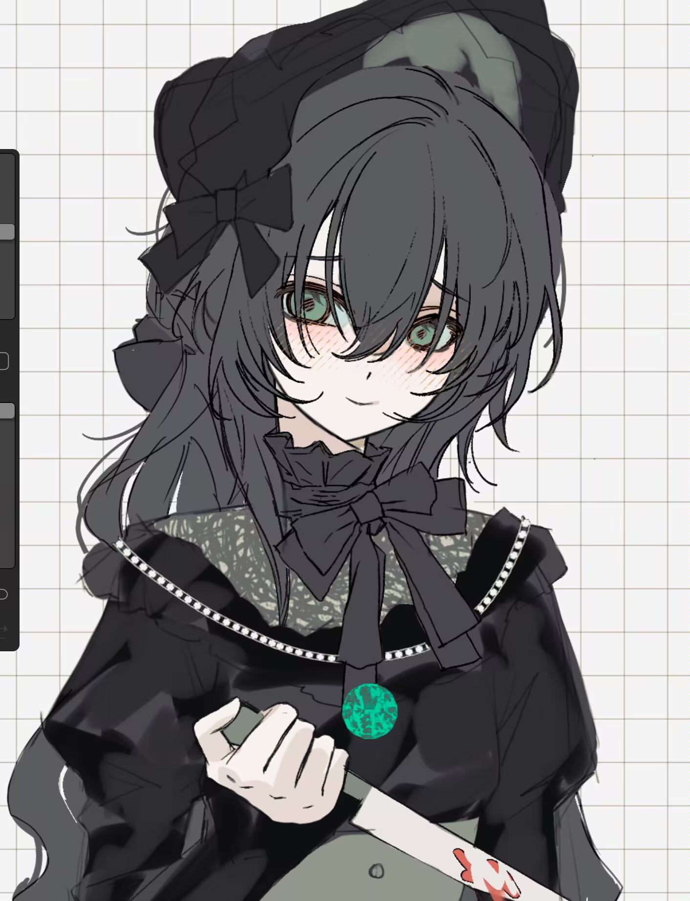 1girl black_bonnet black_dress black_hair black_ribbon blush bonnet breasts closed_mouth degrees_of_lewdity double-parted_bangs dress empty_eyes freesia_quan green_eyes grid_background hair_between_eyes high_collar highres holding holding_knife knife kylar_(degrees_of_lewdity) kylar_(female)_(degrees_of_lewdity) long_hair long_sleeves looking_to_the_side neck_ribbon pale_skin procreate_(medium) procreate_(software) raised_inner_eyebrows ribbon screencap simple_background small_breasts smile solo unfinished upper_body victorian white_background