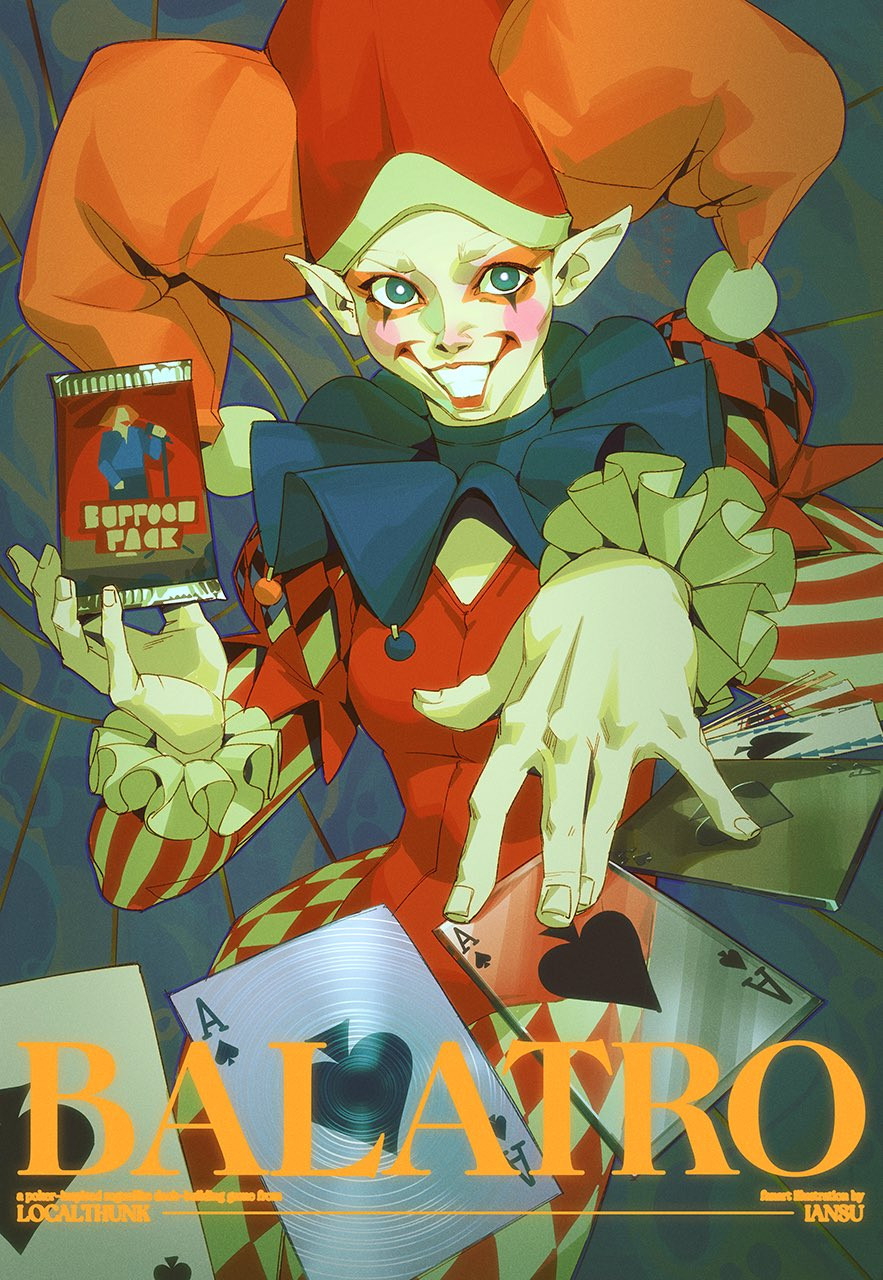 ace_(playing_card) ace_of_spades artist_name bad_link balatro card grin hat highres ian_su jester jester_cap lipstick makeup neck_ruff playing_card pointy_ears smile spade_(shape) striped_sleeves