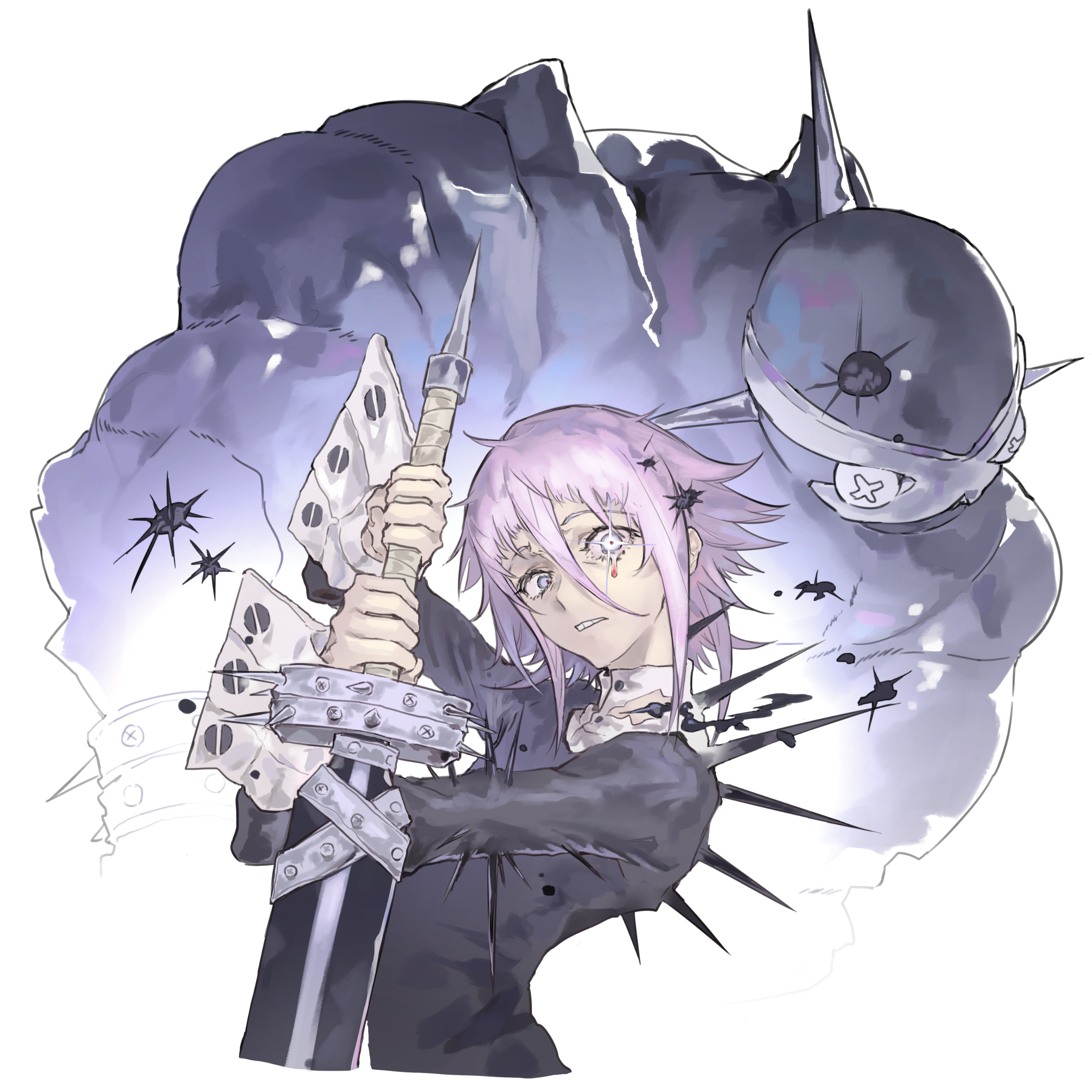 1other absurdres androgynous black_blood black_dress blood blood_drop bloody_tears bornforfreedom crona_(soul_eater) cropped_torso dress glowing glowing_eye hair_between_eyes high_collar highres holding holding_sword holding_weapon long_sleeves looking_at_viewer muscular orb other_focus pink_hair ragnarok_(soul_eater) short_hair sidelocks simple_background sleeve_cuffs soul_eater spikes sword teeth upper_body weapon white_background white_eyes x_x
