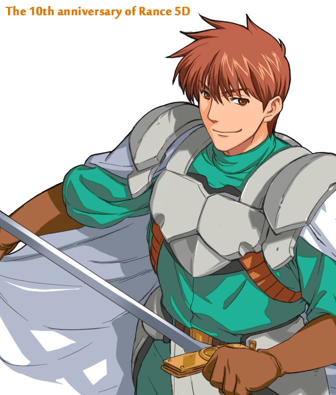 1boy anniversary armor brown_eyes brown_gloves brown_hair cape cape_hold chest_guard closed_mouth english_text gloves green_pants green_shirt holding holding_sword holding_weapon male_focus official_art orion_(orionproject) pants rance rance5d rance_(series) shirt short_hair shoulder_armor sideways_glance simple_background smile solo standing sword upper_body weapon white_background white_cape