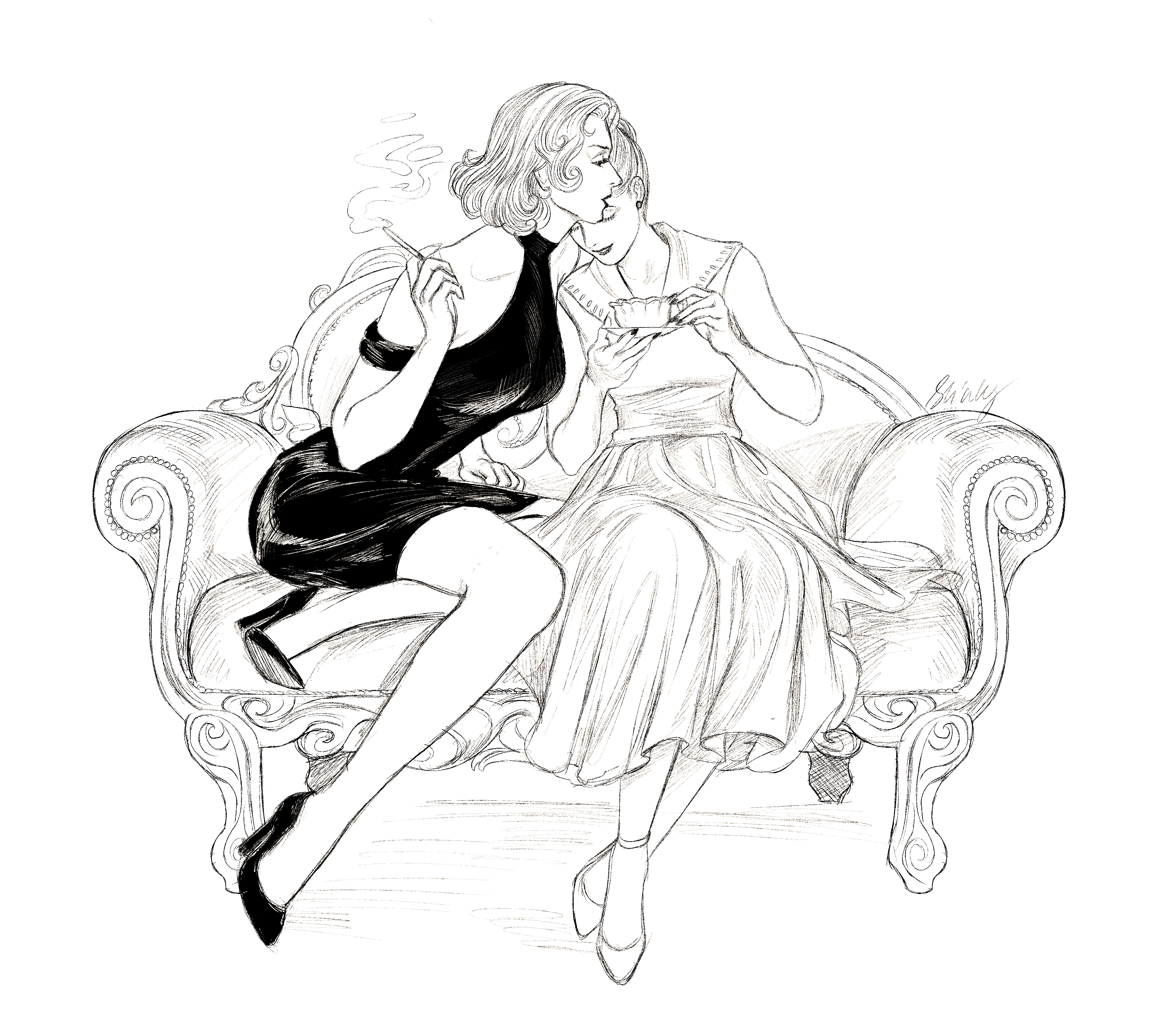 2girls absurdres beth_(veil) cigarette closed_eyes commentary cup dress emma_(veil) hair_bun hair_slicked_back halter_dress halterneck hashtag-only_commentary high_heels highres holding holding_cigarette holding_cup multiple_girls sitting skinky sleeveless sleeveless_dress smile untranslatable_commentary veil_(manga)