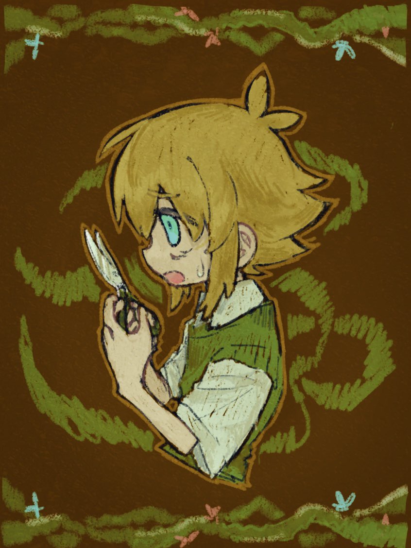 1boy 5_mugiko antenna_hair basil_(faraway)_(omori) basil_(omori) blonde_hair blue_eyes collared_shirt from_side green_sweater_vest hair_between_eyes hashtag-only_commentary male_focus omori open_mouth shirt sidelocks solo sweatdrop sweater_vest upper_body white_shirt