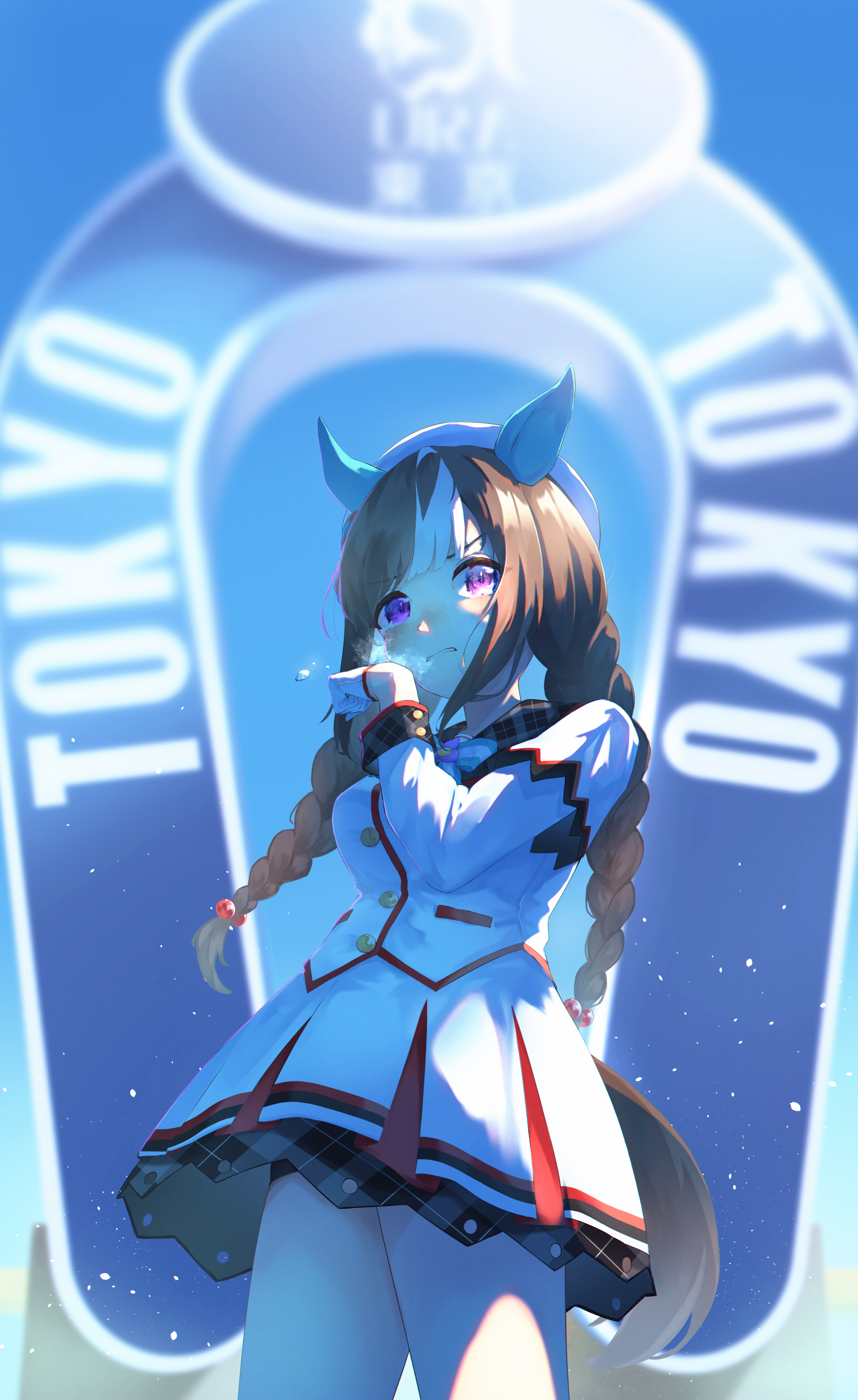 1girl absurdres animal_ears beret blush bow braid breasts breath brown_hair clenched_teeth commentary_request crying ear_covers gloves hat highres hokko_tarumae_(star_light_ship)_(umamusume) hokko_tarumae_(umamusume) horse_ears horse_girl horse_tail jacket long_braid long_hair medium_breasts multicolored_hair parted_lips purple_eyes skirt solo striped_bow striped_hair tail tears teeth tsukuda155 twin_braids umamusume white_gloves white_hair white_hat white_jacket white_skirt
