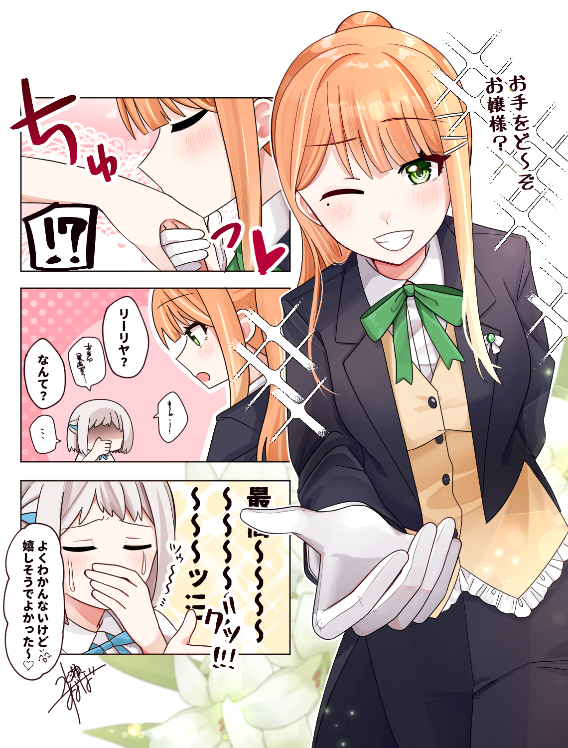 2girls black_jacket black_pants commentary_request gakuen_idolmaster gloves green_eyes grin h77kobato highres idolmaster jacket katsuragi_lilja kiss kissing_hand long_hair mole mole_under_eye multiple_girls one_eye_closed orange_hair pants ponytail shiun_sumika short_hair smile sparkle speech_bubble sweater_vest tears translation_request white_gloves white_hair yellow_sweater_vest yuri