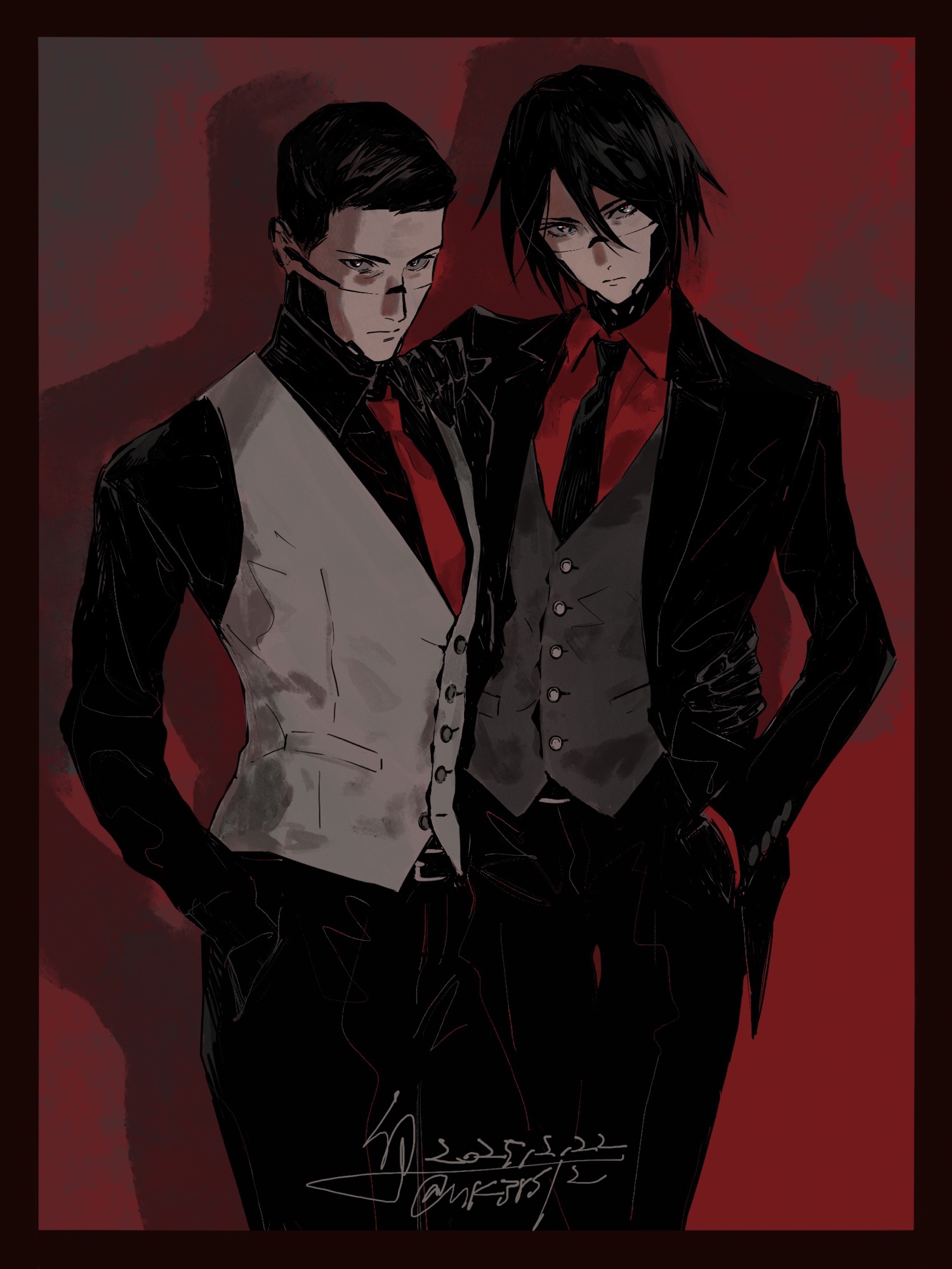1boy 1girl adler_(signalis) alternate_costume android black_hair black_jacket black_necktie black_pants black_suit border buttons collared_shirt cowboy_shot dated elster_(signalis) formal_clothes fune_(nkjrs12) grey_vest hand_in_pocket hand_on_another's_shoulder highres jacket looking_at_viewer necktie pants red_background red_border red_shirt shirt short_hair signalis signature skin_seams standing suit vest white_vest