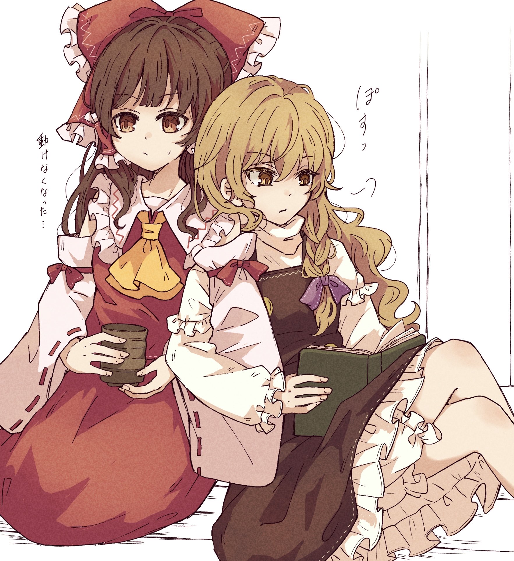 2girls ascot black_skirt black_vest blonde_hair bloomers book bow braid brown_eyes brown_hair commentary_request crossed_legs cup detached_sleeves frilled_bow frilled_hair_tubes frilled_skirt frills hair_bow hair_tubes hakurei_reimu highres himomaru holding holding_book holding_cup kirisame_marisa locked_arms long_hair long_sleeves missing_headwear multiple_girls open_book purple_bow reading red_bow red_skirt ribbon-trimmed_sleeves ribbon_trim seiza side_braid single_braid sitting skirt skirt_set touhou translation_request underwear vest white_bloomers yellow_ascot yellow_eyes yunomi yuri