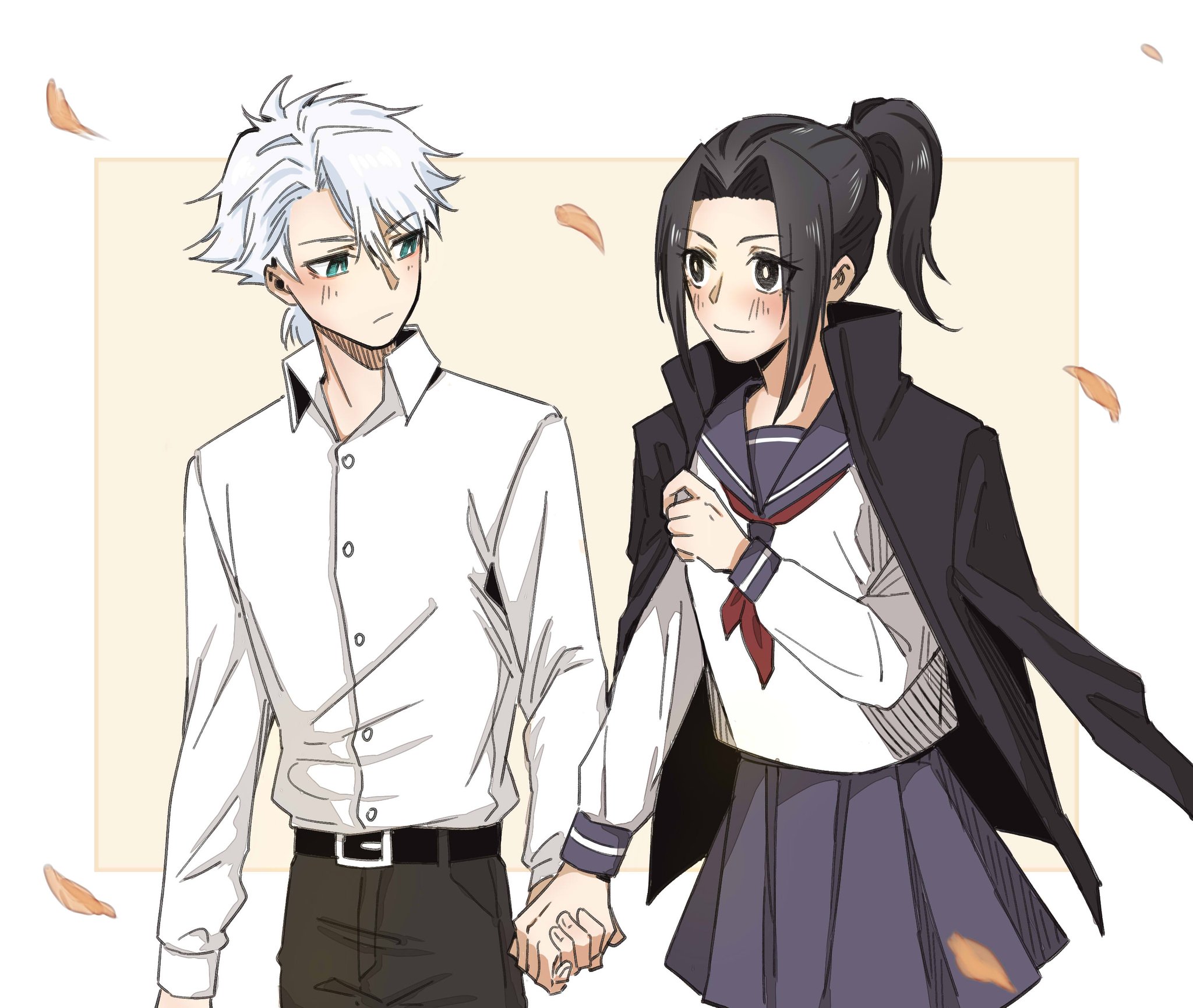 1boy 1girl alternate_universe aqua_eyes black_eyes black_hair bleach bleach:_sennen_kessen-hen chinese_text food gakuran high_ponytail highres hitsugaya_toushirou holding_hands jacket jacket_on_shoulders kurosaki_karin leaf long_sleeves ponytail school_uniform serafuku shirt silegesi smile translation_request white_hair white_shirt