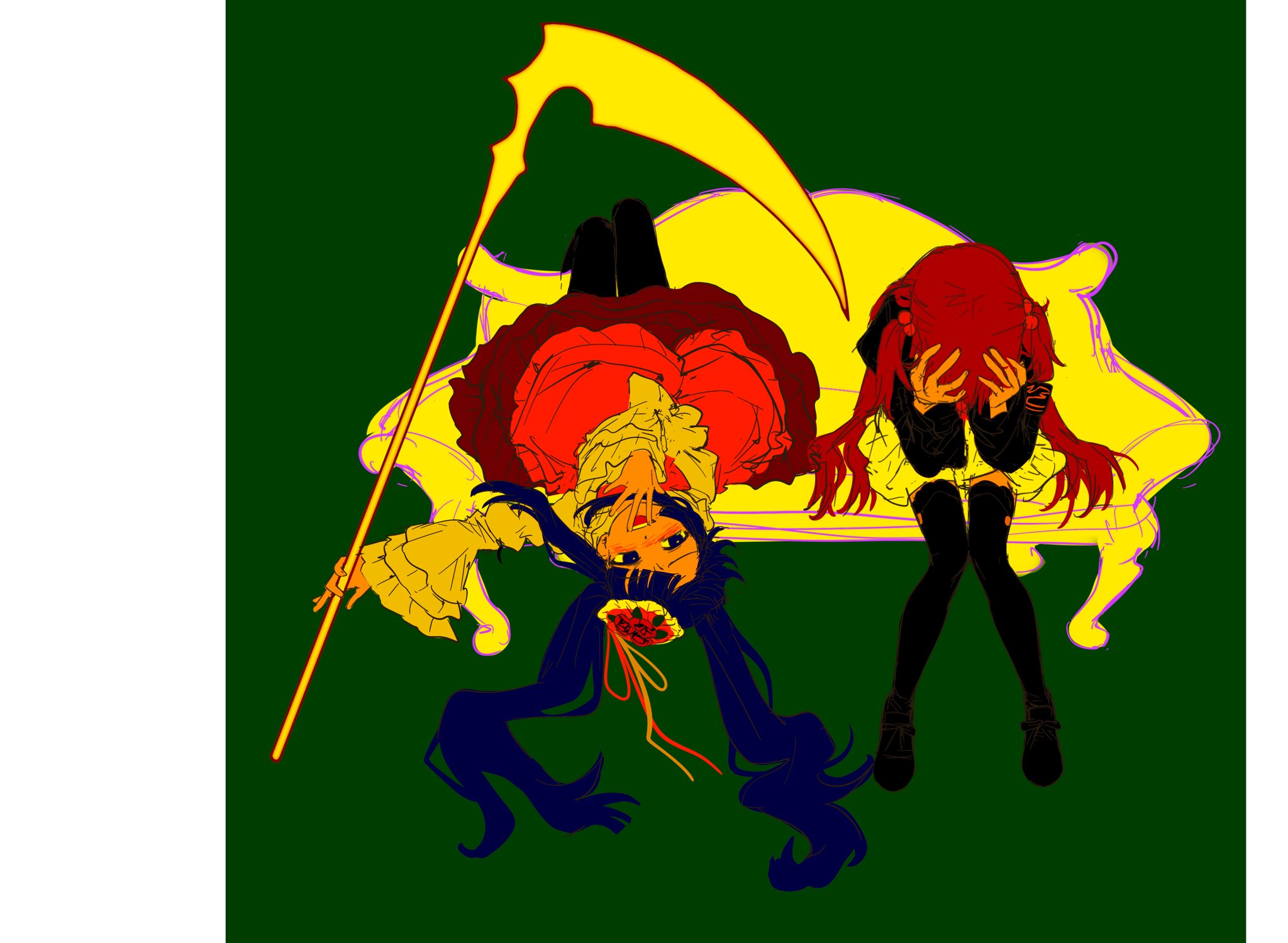 2girls black_thighhighs blue_hair border couch frilled_sleeves frills furudo_erika green_background hashtag-only_commentary highres holding holding_scythe long_hair multiple_girls red_hair scythe sitting thighhighs twintails two_side_up umineko_no_naku_koro_ni upside-down ushiromiya_ange white_border xian_(xyn17cmlq)