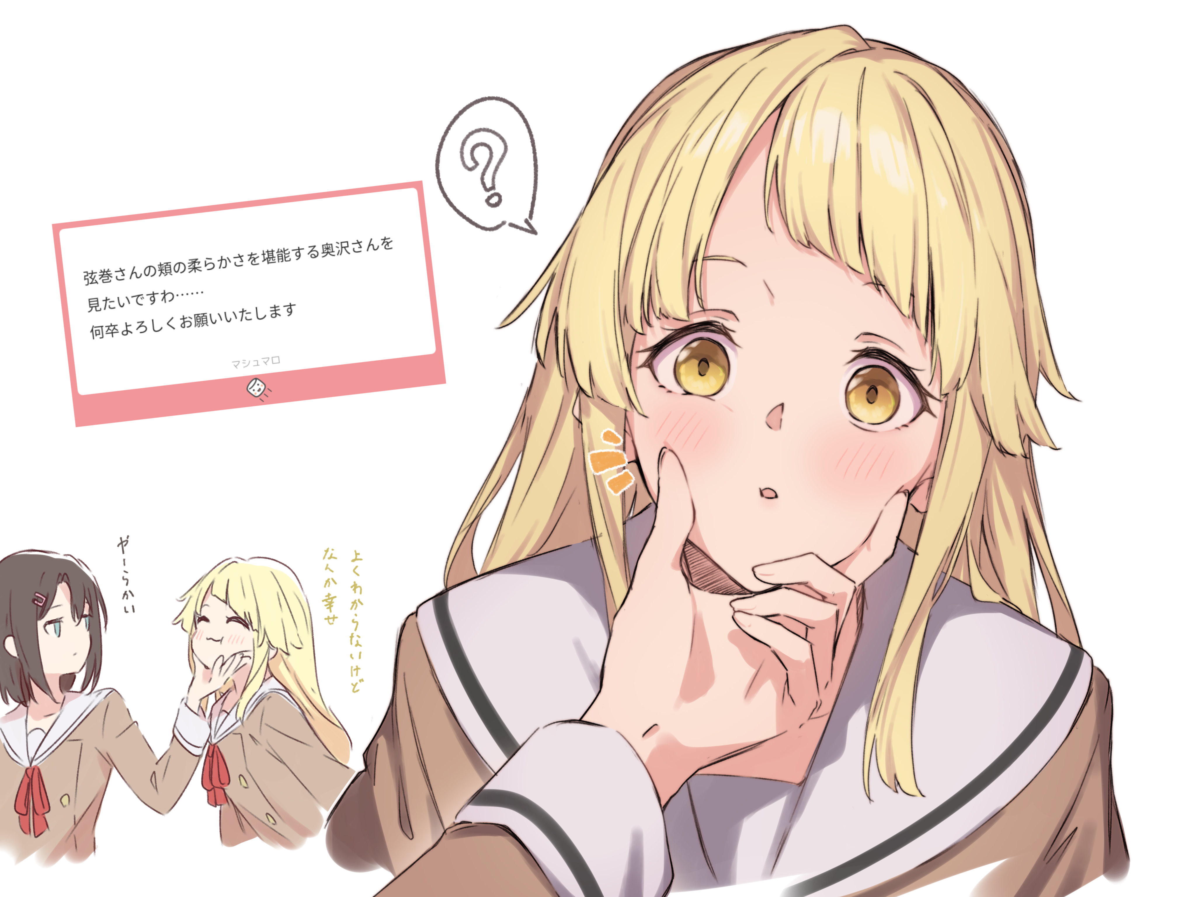 2girls :3 ? ^_^ absurdres bang_dream! bang_dream!_girls_band_party! blonde_hair blush cheek_pinching closed_eyes commentary_request hair_ornament hairclip hanasakigawa_school_uniform highres kanade_(kanade_3344) long_hair long_sleeves looking_at_viewer marshmallow_(site) multiple_girls okusawa_misaki open_mouth pinching red_ribbon request_inset ribbon sailor_collar school_uniform short_hair simple_background translated tsurumaki_kokoro white_background white_sailor_collar