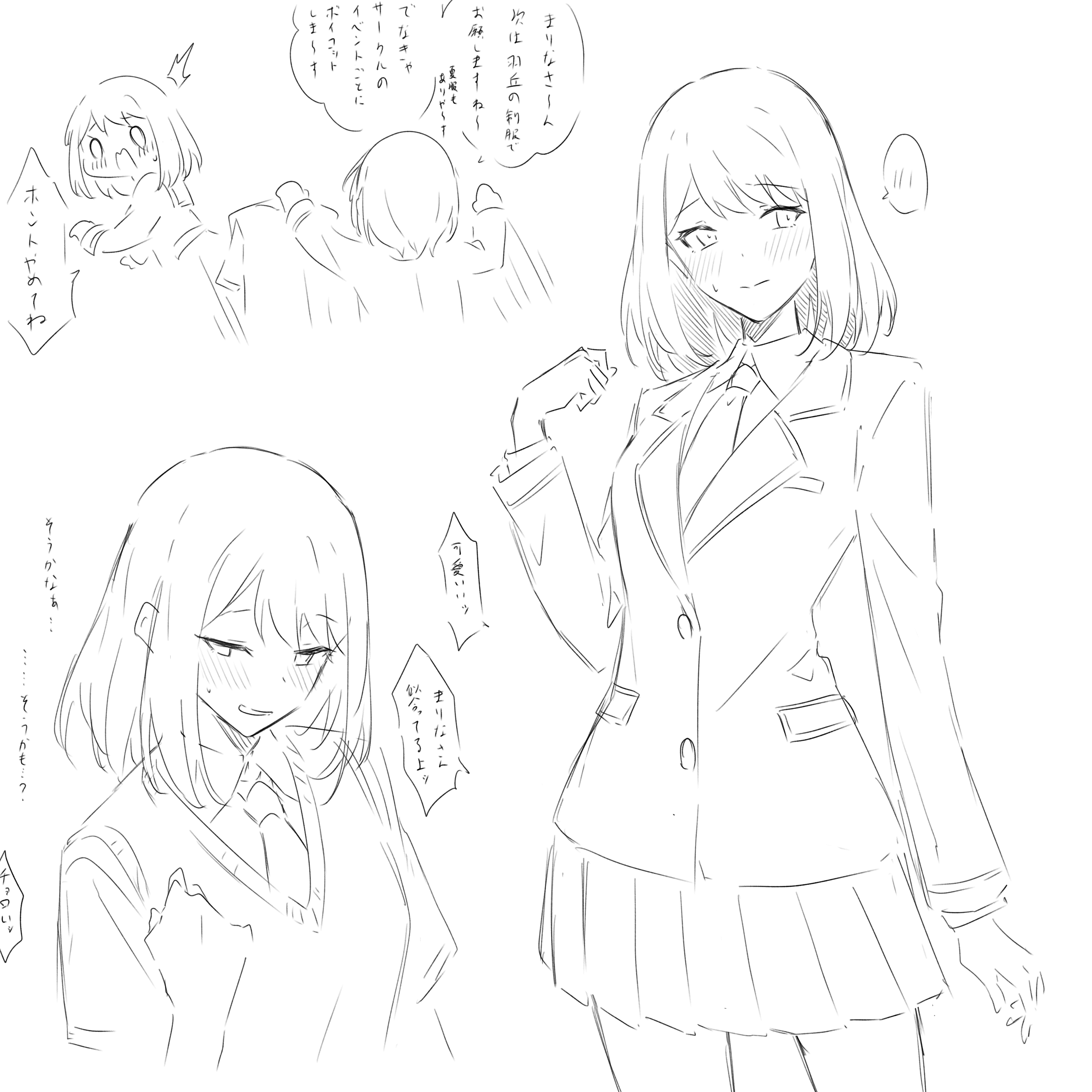 2girls absurdres aoba_moca bang_dream! bang_dream!_girls_band_party! blazer blush closed_mouth commentary_request greyscale hanasakigawa_school_uniform haneoka_school_uniform highres jacket kanade_(kanade_3344) medium_hair monochrome multiple_girls necktie open_mouth pleated_skirt school_uniform short_hair skirt sweatdrop sweater_vest tsukishima_marina