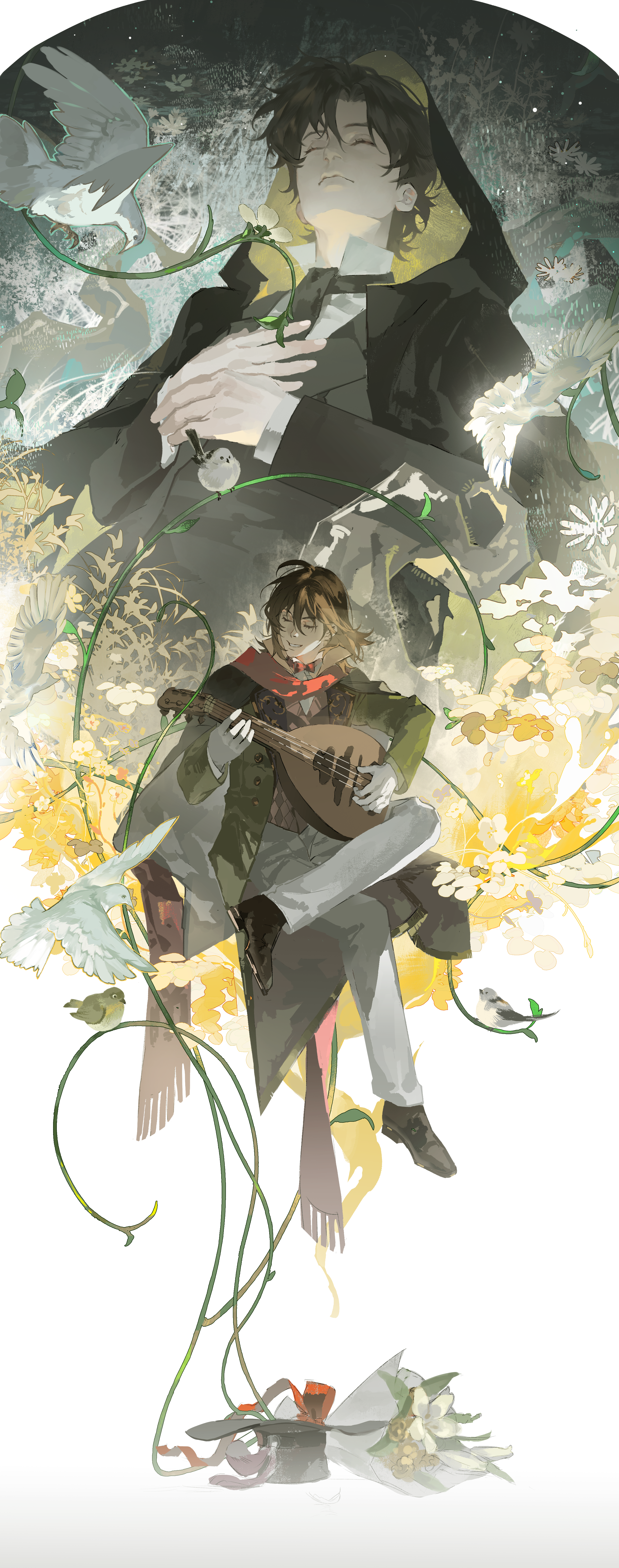 2boys absurdres bird black_cloak black_hair black_jacket black_necktie black_shoes bouquet brown_hair chinese_commentary cloak closed_eyes commentary_request crossed_legs curtained_hair dove dual_persona flower full_body gloves grass green_jacket grey_pants hair_between_eyes hands_on_own_chest hat highres holding holding_instrument holding_lute hood hood_up hooded_cloak huixingweiqi instrument invisible_chair jacket klein_moretti long_sleeves lord_of_the_mysteries lute_(instrument) lying male_focus medium_hair merlin_hermes monocle multiple_boys music necktie on_back on_ground pants plant playing_instrument red_scarf scarf shirt shoes short_hair sitting smile top_hat unworn_hat unworn_headwear vines white_bird white_flower white_gloves white_shirt