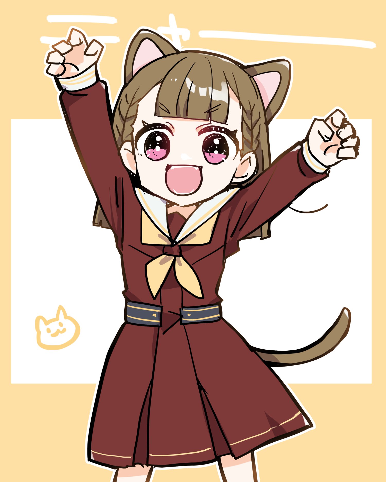 1girl animal_ears arms_up border braid brown_dress brown_hair cat_ears cat_girl cat_tail center-flap_bangs claw_pose commentary_request cowboy_shot dress hasu_no_sora_school_uniform highres kachimachi_kosuzu kanduki_kamibukuro kemonomimi_mode link!_like!_love_live! long_sleeves looking_at_viewer love_live! nyan outside_border pink_eyes sailor_collar sailor_dress school_uniform side_braids solo tail v-shaped_eyebrows virtual_youtuber white_background white_sailor_collar winter_uniform yellow_border