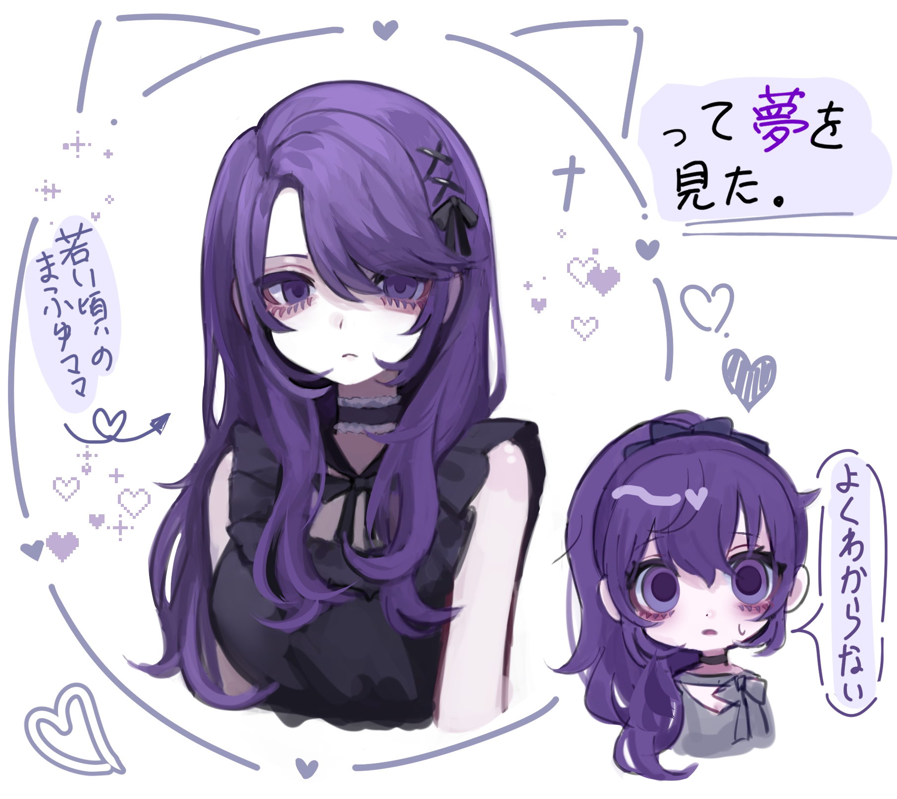 2girls arms_at_sides arrow_(symbol) asahina_mafuyu bags_under_eyes bare_shoulders black_bow black_shirt bow breasts chibi chibi_inset choker closed_mouth commentary_request cropped_torso empty_eyes frilled_choker frilled_shirt frills hair_bow hair_down hair_over_shoulder heart highres imagining jishou_210 long_hair medium_breasts multiple_girls parted_lips ponytail project_sekai purple_choker purple_eyes purple_hair shirt simple_background sleeveless sleeveless_shirt sweatdrop translated white_background
