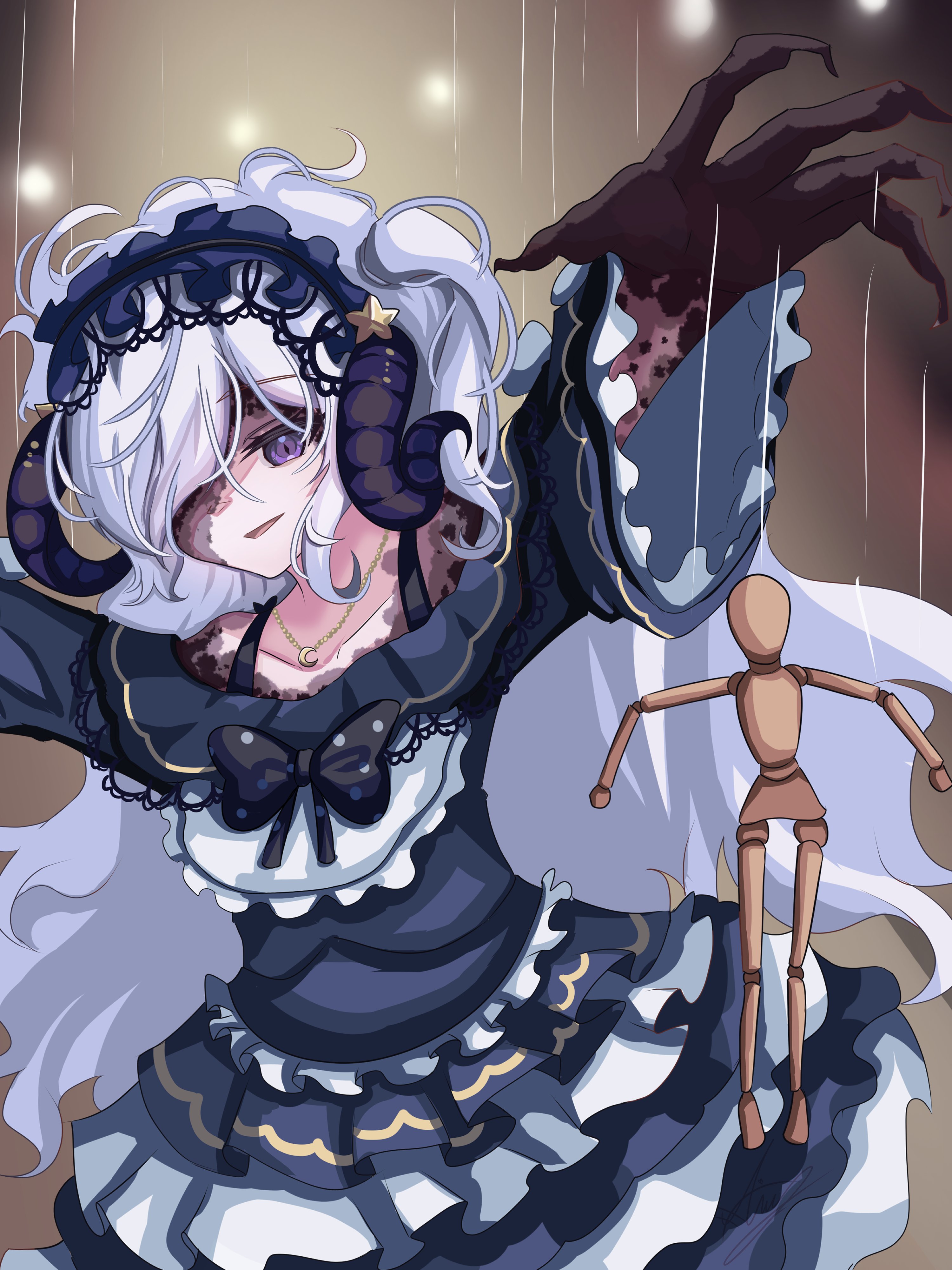 1girl absurdres blue_hairband bow colored_extremities colored_skin crescent crescent_necklace curved_horns demon_horns drawing_mannequin dress fingernails frilled_dress frills goat_horns gothic_lolita h_ans_(hmn_anz) hair_over_one_eye hairband highres horns jewelry lolita_fashion lolita_hairband long_hair mahou_shoujo_no_majo_saiban messy_hair natsume_an-an necklace parted_lips polka_dot polka_dot_bow puppet_strings purple_eyes sharp_fingernails solo very_long_hair white_hair witch_(manosaba)