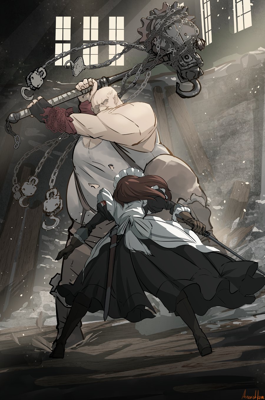 1boy 1girl apron asterisk_kome bald black_dress boots brown_hair chain commentary_request dress fat fat_man fighting fighting_stance gina_wallace gloves hammer heroes_of_order highres holding holding_hammer holding_sword holding_weapon hook indoors juliet_sleeves legs_apart light_particles light_rays long_hair long_sleeves maid maid_apron maid_headdress puffy_sleeves scabbard sheath signature sword war_hammer weapon