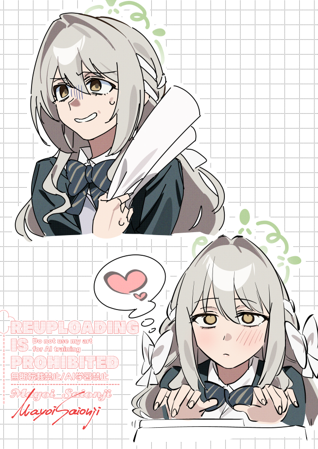 1girl artist_name blue_archive blush bow bowtie braid clip_studio_paint_(medium) closed_mouth cropped_shoulders diagonal-striped_bow diagonal-striped_bowtie diagonal-striped_clothes distracted empty_eyes fingernails furrowed_brow green_halo grey_hair grid_background grin hair_intakes hair_ribbon half_crown_braid halo heart holding jacket long_hair looking_ahead miyo_(blue_archive) multiple_views nervous nervous_smile ribbon ribbon_braid rolled-up_paper saionji_mayoi school_uniform sidelocks smile speech_bubble spoken_heart striped_bow striped_bowtie striped_clothes sweatdrop thought_bubble turn_pale typing upturned_eyes watermark white_background white_bow white_ribbon winter_uniform yellow_eyes