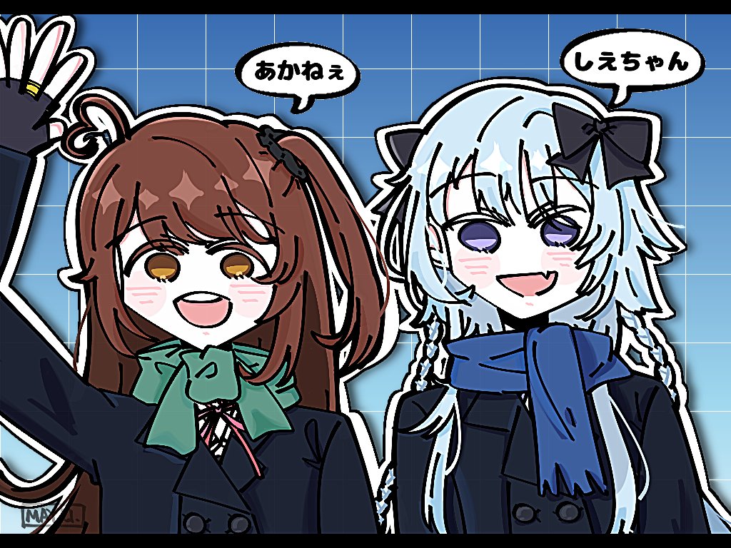 2girls :d ahoge arm_at_side arm_up arms_at_sides artist_name assault_lily black_bow black_gloves black_jacket black_scrunchie blue_background blue_hair blue_scarf bow braid brown_eyes brown_hair buttons commentary_request double-breasted fang fingerless_gloves gloves gradient_background green_scarf grid_background hair_bow hair_ornament hair_scrunchie heart heart_ahoge jacket jewelry letterboxed long_hair long_sleeves looking_at_viewer mayu_(yu_e1602) mori_tatsuki multiple_girls neck_ribbon one_eye_closed open_mouth pink_ribbon purple_eyes ribbon ring scarf scrunchie side-by-side side_braids skin_fang smile speech_bubble takasuga_tsukushi teeth translated twin_braids upper_body upper_teeth_only