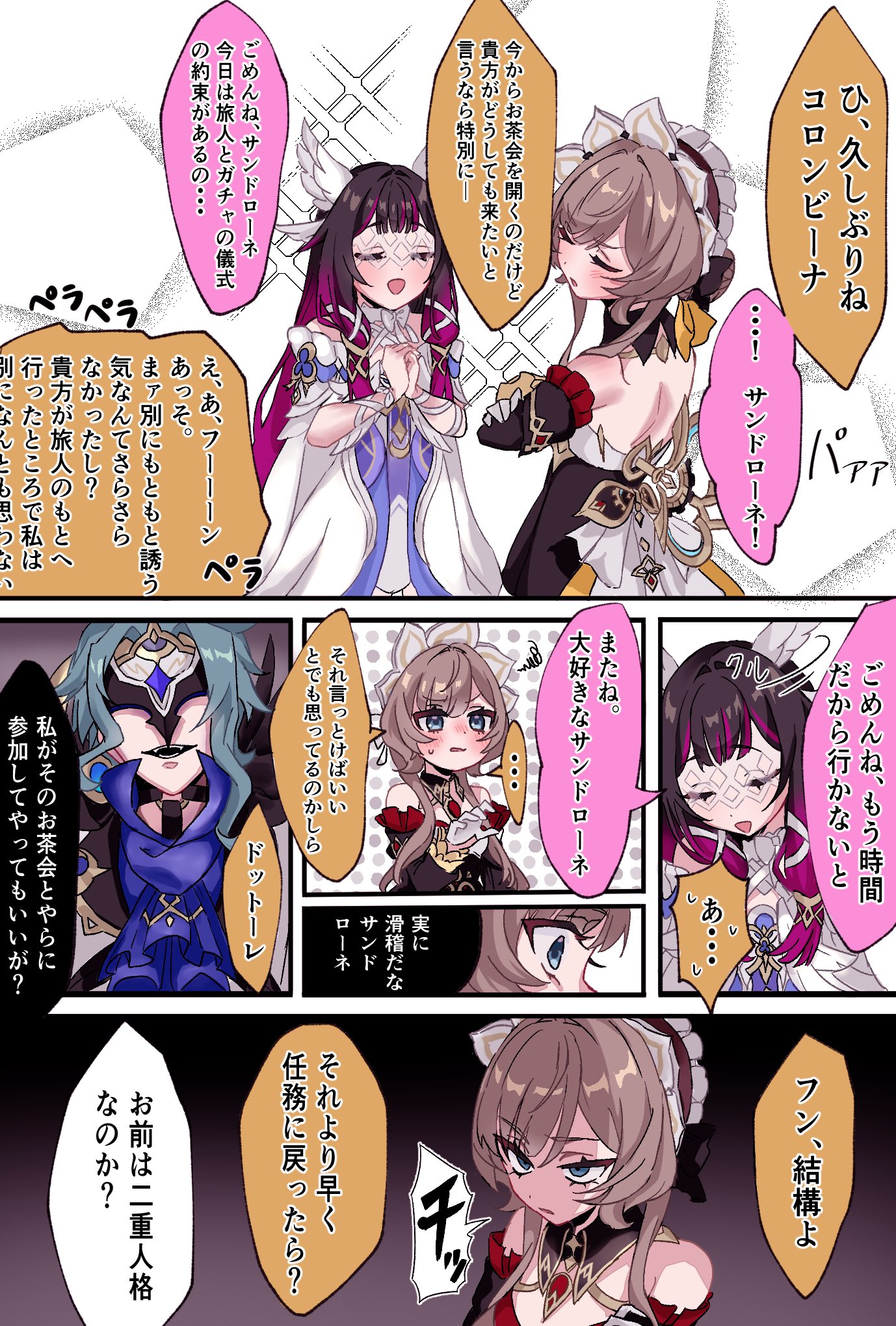 2girls bare_shoulders black_hair blonde_hair blue_eyes closed_eyes columbina_(genshin_impact) commentary_request dottore_(genshin_impact) dress genshin_impact head_wings highres multicolored_hair multiple_girls sandrone_(genshin_impact) smile tensei_erinngi white_dress wings