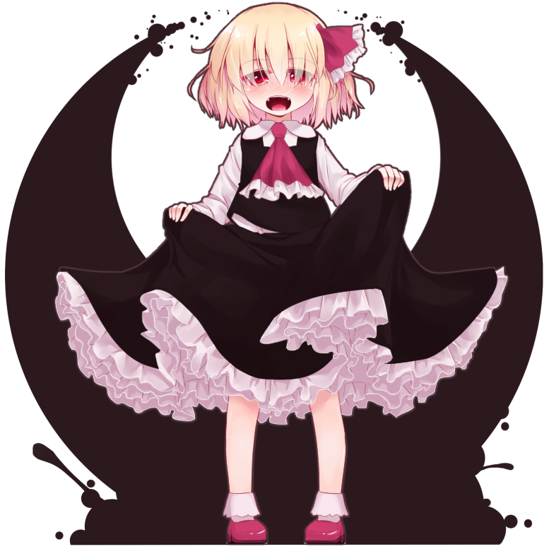 1girl ascot black_skirt black_vest blonde_hair collared_shirt commentary_request darkness fangs full_body hair_ribbon long_sleeves open_mouth razy_(skuroko) red_ascot red_eyes red_ribbon red_shoes ribbon rumia shirt shoes short_hair simple_background skirt skirt_hold socks solo touhou vest white_background white_shirt white_socks