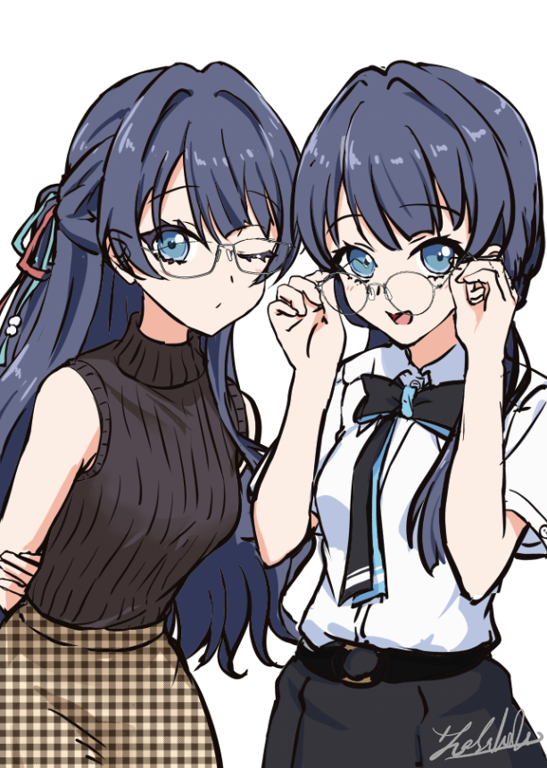 2girls bare_shoulders bespectacled black_bow black_bowtie black_skirt black_sweater blue_eyes blue_hair bow bowtie closed_mouth collared_shirt commentary_request dual_persona gingham_clothes gingham_skirt glasses link!_like!_love_live! looking_at_viewer love_live! multiple_girls murano_sayaka murano_sayaka_(summer_loungewear) one_eye_closed open_mouth pleated_skirt satolive20 shirt signature simple_background skirt sleeveless sleeveless_sweater smile sweater turtleneck turtleneck_sweater virtual_youtuber white_background white_shirt