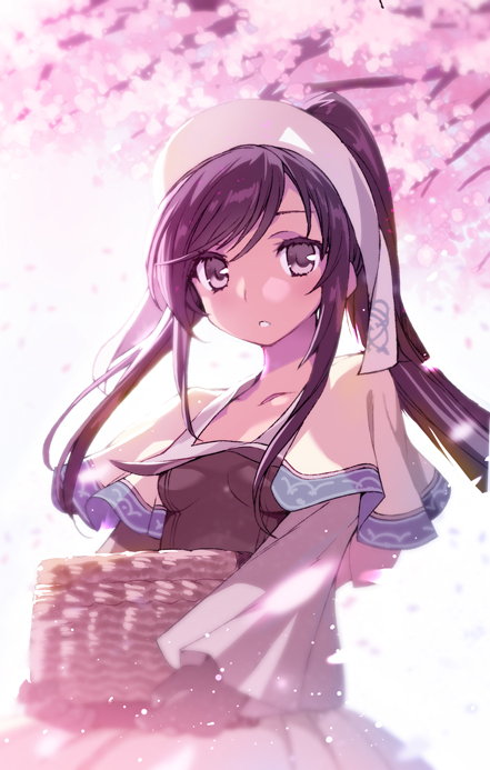 1girl basket black_hair brown_eyes brown_shirt cherry_blossoms high_ponytail holding holding_basket lappet long_hair looking_at_viewer official_art onono_imoko outdoors parted_lips ponytail rance_(series) rance_ix russian_kalette shirt skirt solo tree upper_body white_skirt