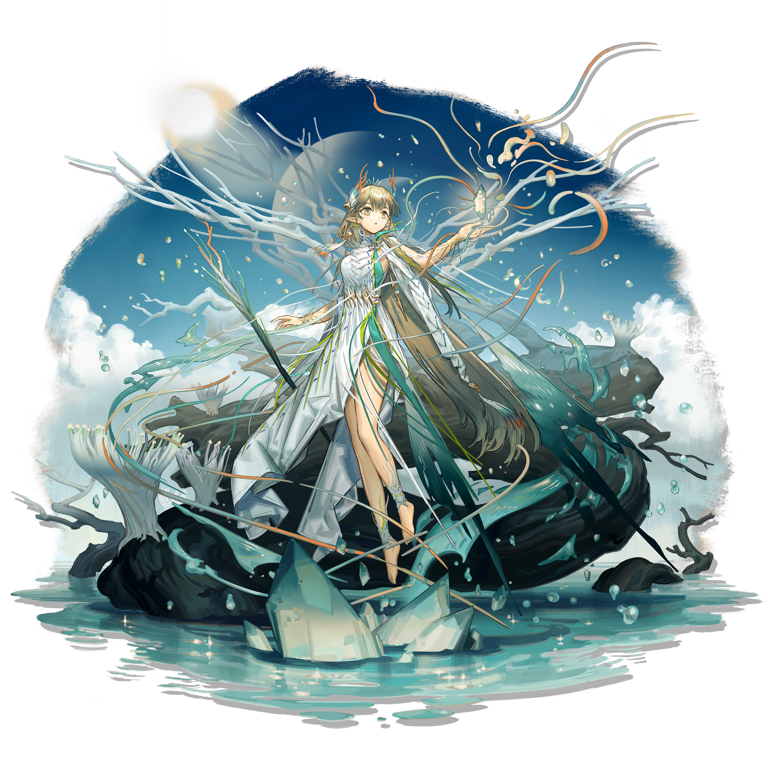1girl absurdres animal_ears anklet arknights bare_legs barefoot blonde_hair blue_sky brown_hair cloud dress elf full_body hair_ornament highres jewelry long_hair muelsyse_(arknights) muelsyse_(young_branch)_(arknights) norizc official_alternate_costume official_art pointy_ears rock sky solo third-party_source transparent_background very_long_hair water white_dress yellow_eyes