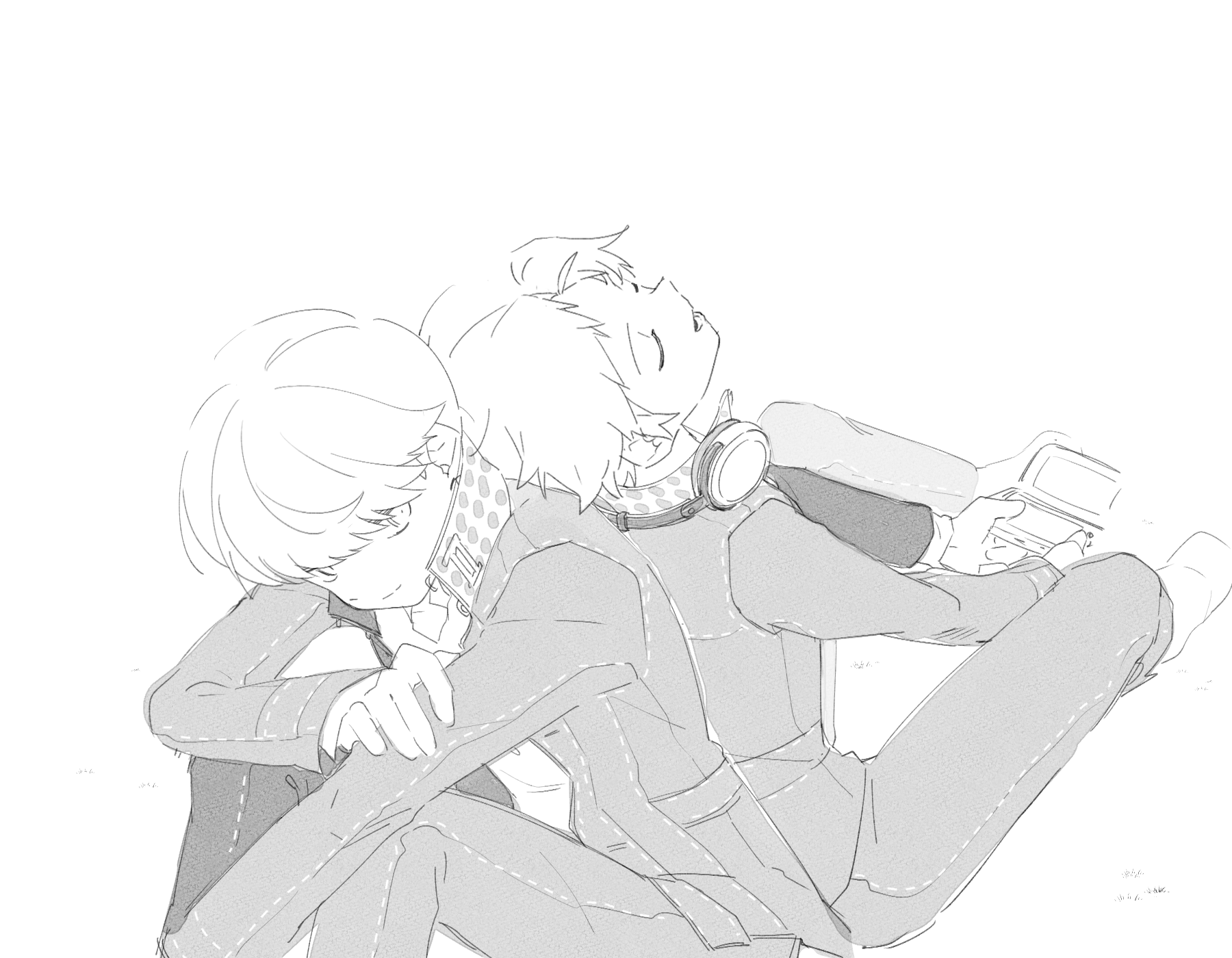 2boys back-to-back closed_eyes closed_mouth greyscale hanamura_yousuke handheld_game_console highres holding holding_handheld_game_console jacket kkyagdoyo164972 long_sleeves male_focus monochrome multiple_boys narukami_yu nintendo_ds open_mouth pants persona persona_4 school_uniform short_hair simple_background sitting white_background yasogami_school_uniform