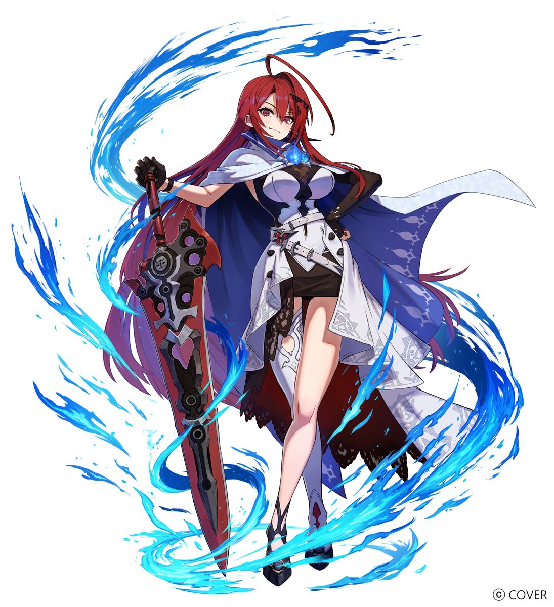 1girl ahoge blue_fire blue_hair breasts cloak colored_inner_hair dress elizabeth_rose_bloodflame enigmatic_recollection fire fire_on_chest full_body greatsword highres hololive hololive_english huge_ahoge huge_weapon kuroi_susumu long_hair looking_at_viewer multicolored_hair official_art red_eyes red_hair smile solo sword thorn_(elizabeth_rose_bloodflame) two-tone_hair very_long_hair virtual_youtuber weapon white_cloak