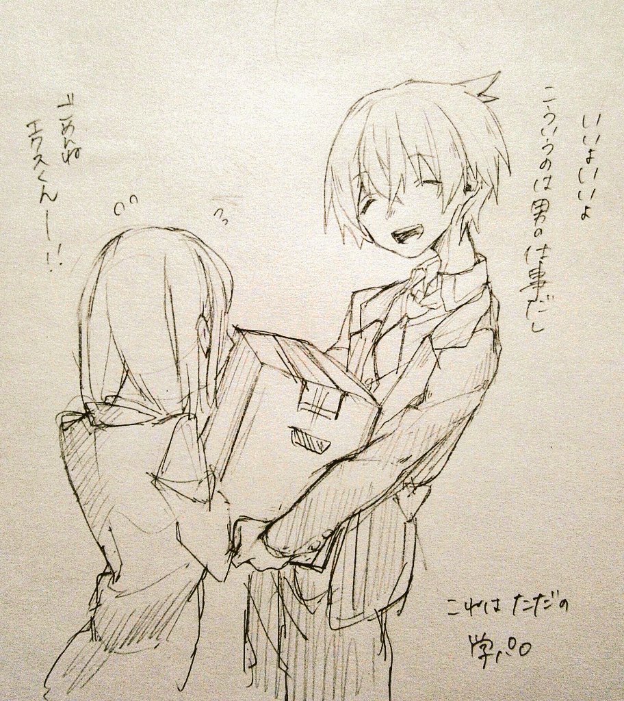 1boy 1girl alternate_costume box closed_eyes cowboy_shot crossed_bangs flying_sweatdrops from_behind grimms_notes hair_between_eyes holding holding_box jacket monochrome open_mouth pants reina_(grimms_notes) shino_(5no) simple_background smile standing traditional_media translation_request upper_body