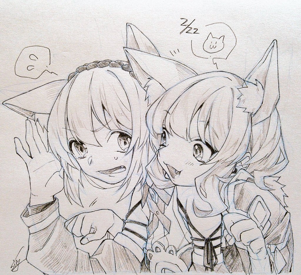 2girls animal_ear_fluff animal_ears cat_ears cat_girl dated detached_sleeves fam_(grimms_notes) fam_(original)_(grimms_notes) fang flying_sweatdrops fur-trimmed_jacket fur_trim grimms_notes hand_up hands_up jacket kemonomimi_mode long_sleeves looking_at_another monochrome multiple_girls paw_pose puffy_long_sleeves puffy_sleeves reina_(grimms_notes) reina_(original)_(grimms_notes) shino_(5no) simple_background spoken_flying_sweatdrops sweatdrop traditional_media upper_body