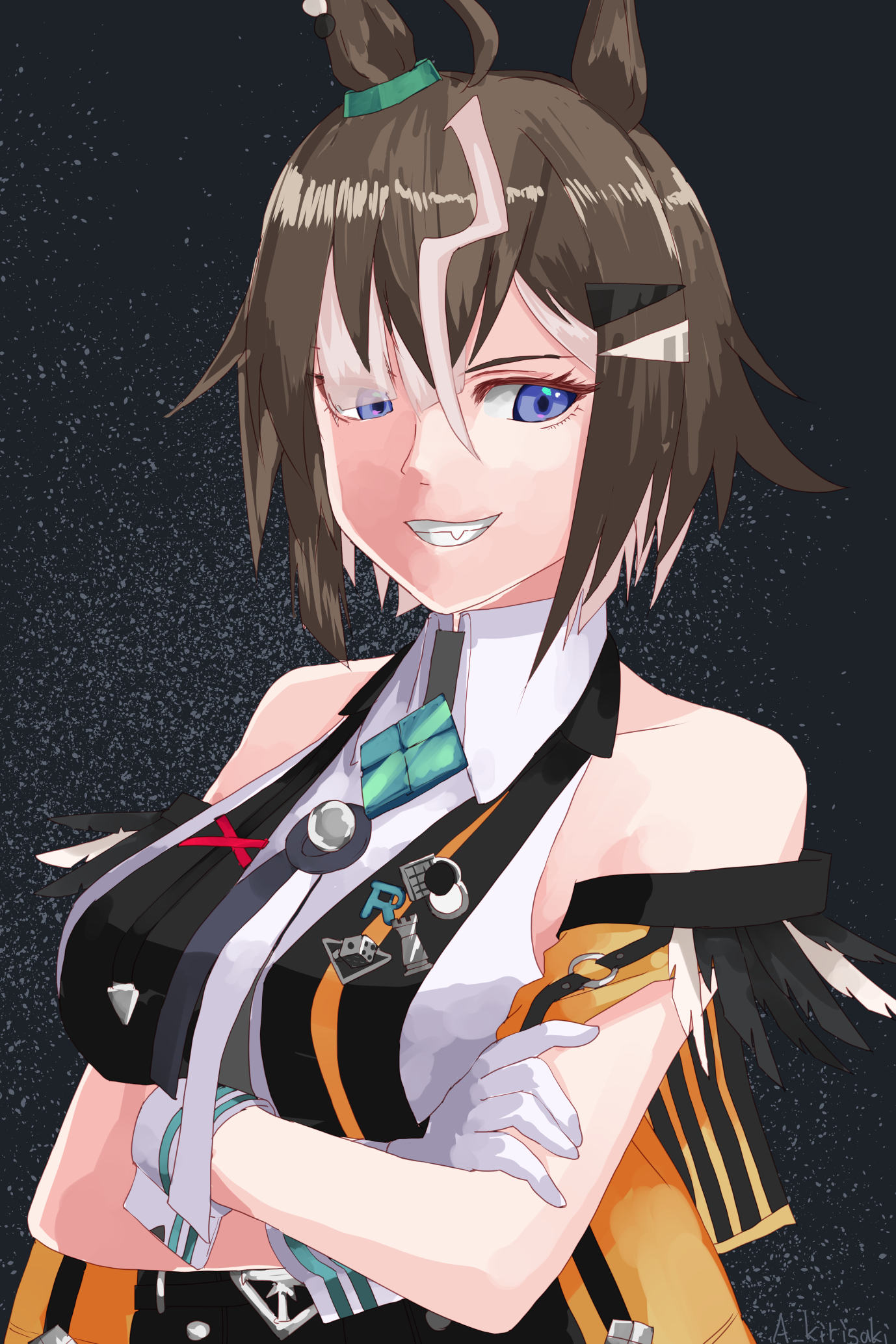 1girl ahoge animal_ears arms_under_breasts black_shirt blue_eyes brown_hair collared_shirt commentary_request crossed_arms eyes_visible_through_hair fang gloves grey_hair hair_ornament hair_over_one_eye highres horse_ears horse_girl kirisaki_akihito looking_at_viewer multicolored_hair portrait rulership_(umamusume) shirt sleeveless sleeveless_shirt smile solo streaked_hair umamusume upper_body white_gloves