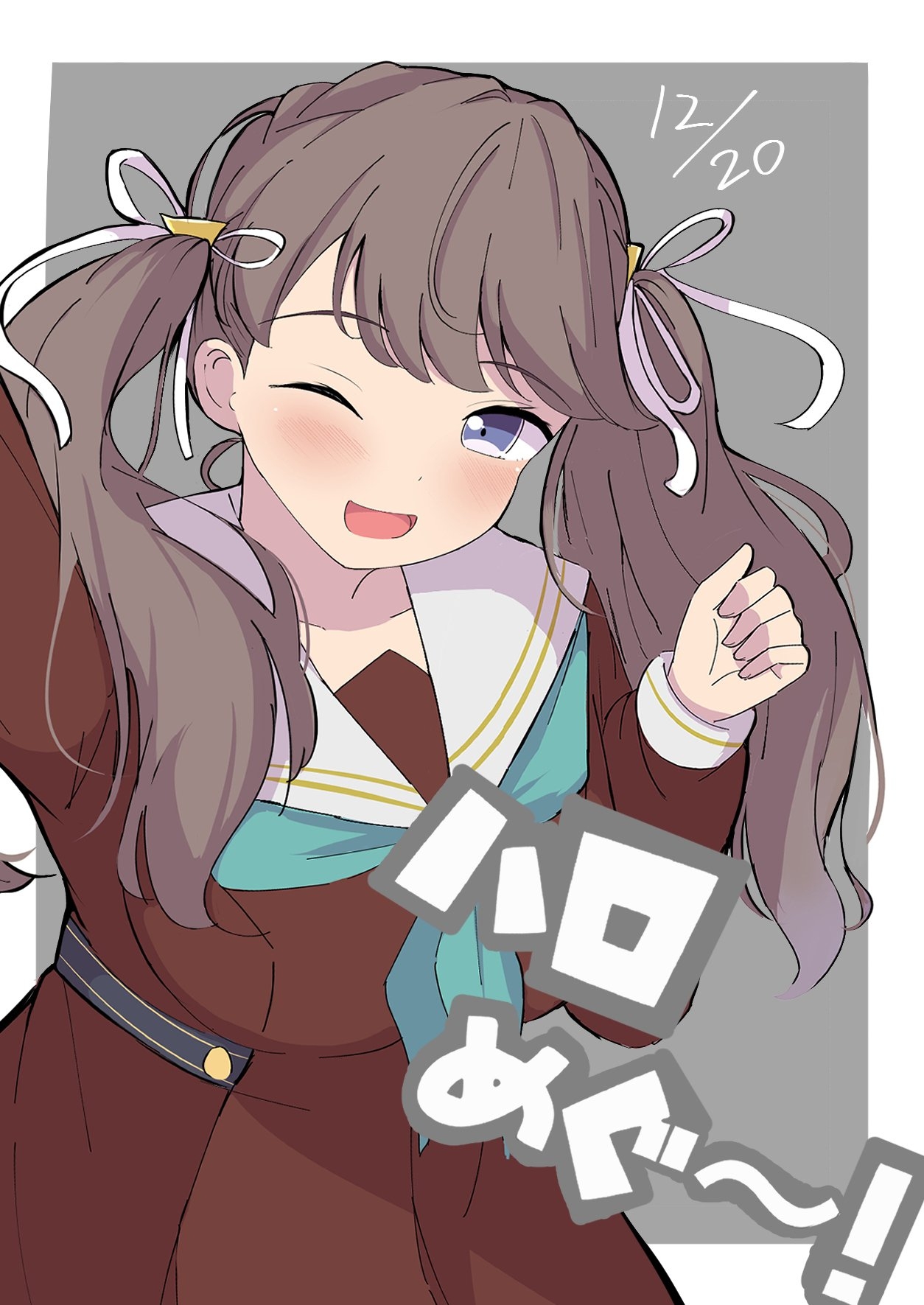 1girl ;d border breasts brown_dress collarbone commentary_request cowboy_shot dated dress fujishima_megumi grey_background grey_eyes hair_ornament hair_ribbon hasu_no_sora_school_uniform hellomegu! highres kaudon large_breasts link!_like!_love_live! long_sleeves looking_at_viewer love_live! on_your_mark_(love_live!) one_eye_closed open_mouth outside_border ribbon sailor_collar sailor_dress school_uniform simple_background smile solo triangle_hair_ornament virtual_youtuber white_border white_ribbon white_sailor_collar winter_uniform