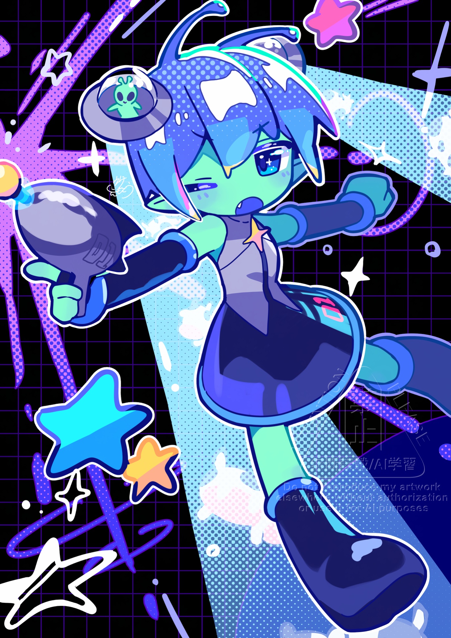 1girl ;o alternate_hair_length alternate_hairstyle antennae black_background black_boots black_skirt black_sleeves blue_eyes blue_hair blush boots commentary detached_sleeves double-parted_bangs english_commentary fang full_body grey_shirt grid_background gun hair_between_eyes hatsune_miku highres holding holding_gun holding_weapon knee_boots long_sleeves one_eye_closed open_mouth outline shirt short_hair signature skirt sleeveless sleeveless_shirt solo standing star_(symbol) ufo_hair_ornament usa_motou vocaloid watermark weapon white_outline