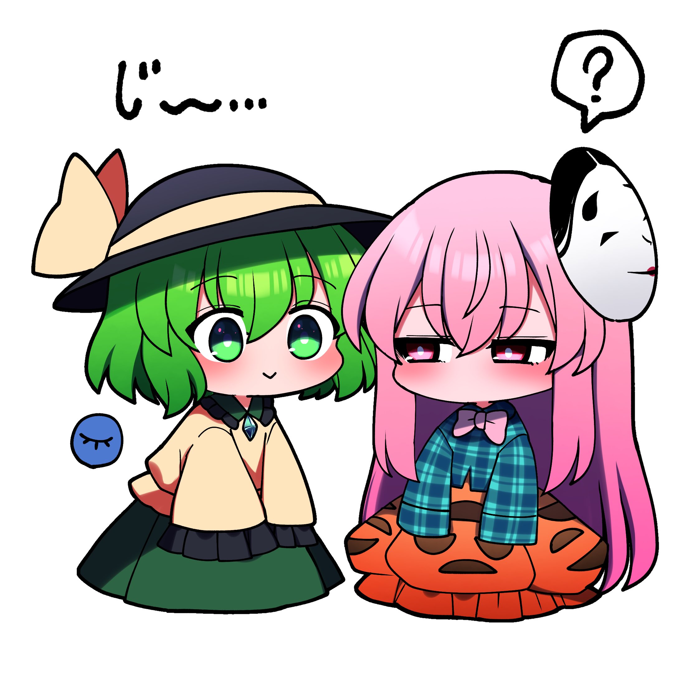 2girls ? bad_id bad_twitter_id black_hat black_shoes blush bow bowtie bright_pupils chibi chibi_only closed_mouth commentary_request frilled_sleeves frills green_eyes green_hair green_skirt hat hata_no_kokoro heart highres hyottoko_mask komeiji_koishi light_smile long_skirt long_sleeves looking_at_another mask mask_on_head medium_hair multiple_girls no_mouth no_nose orange_skirt pink_bow pink_bowtie pink_eyes pink_hair shirt shoes sitting skirt sleeves_past_fingers sleeves_past_wrists spoken_question_mark third_eye touhou traditional_bowtie white_pupils you_(noanoamoemoe)