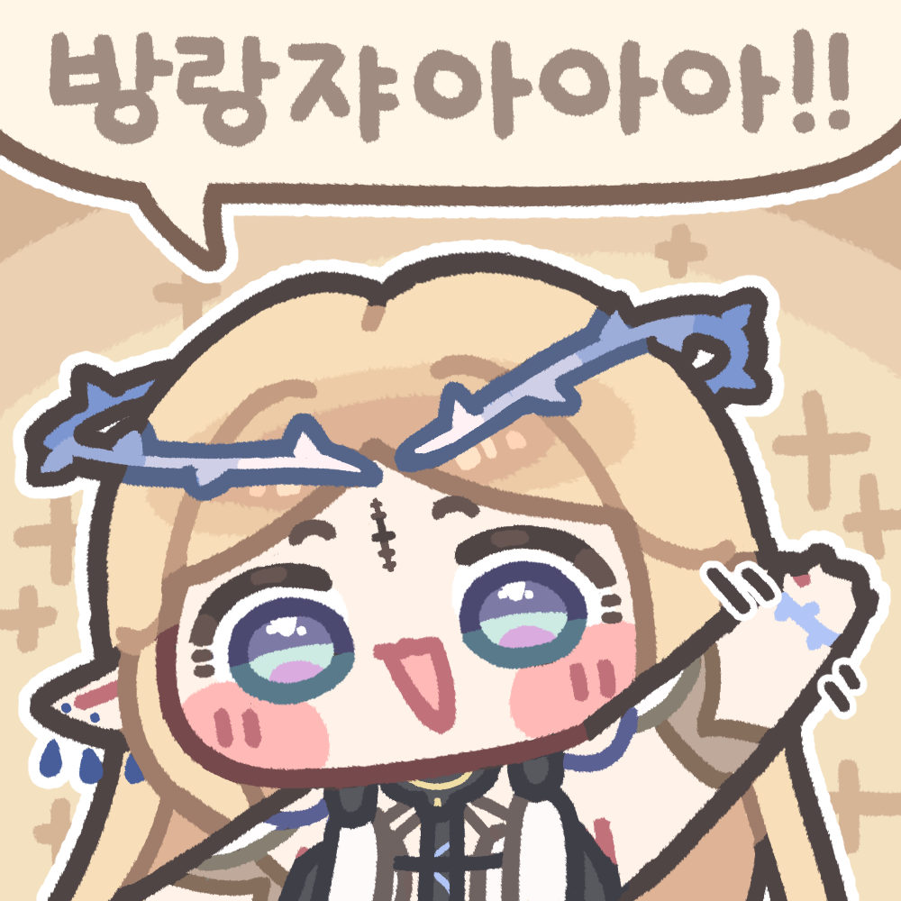 1girl blonde_hair blue_eyes cartethyia_(wuthering_waves) commentary_request korean_commentary korean_text long_hair monyami open_mouth smile solo tacet_mark_(wuthering_waves) translation_request upper_body waving wuthering_waves