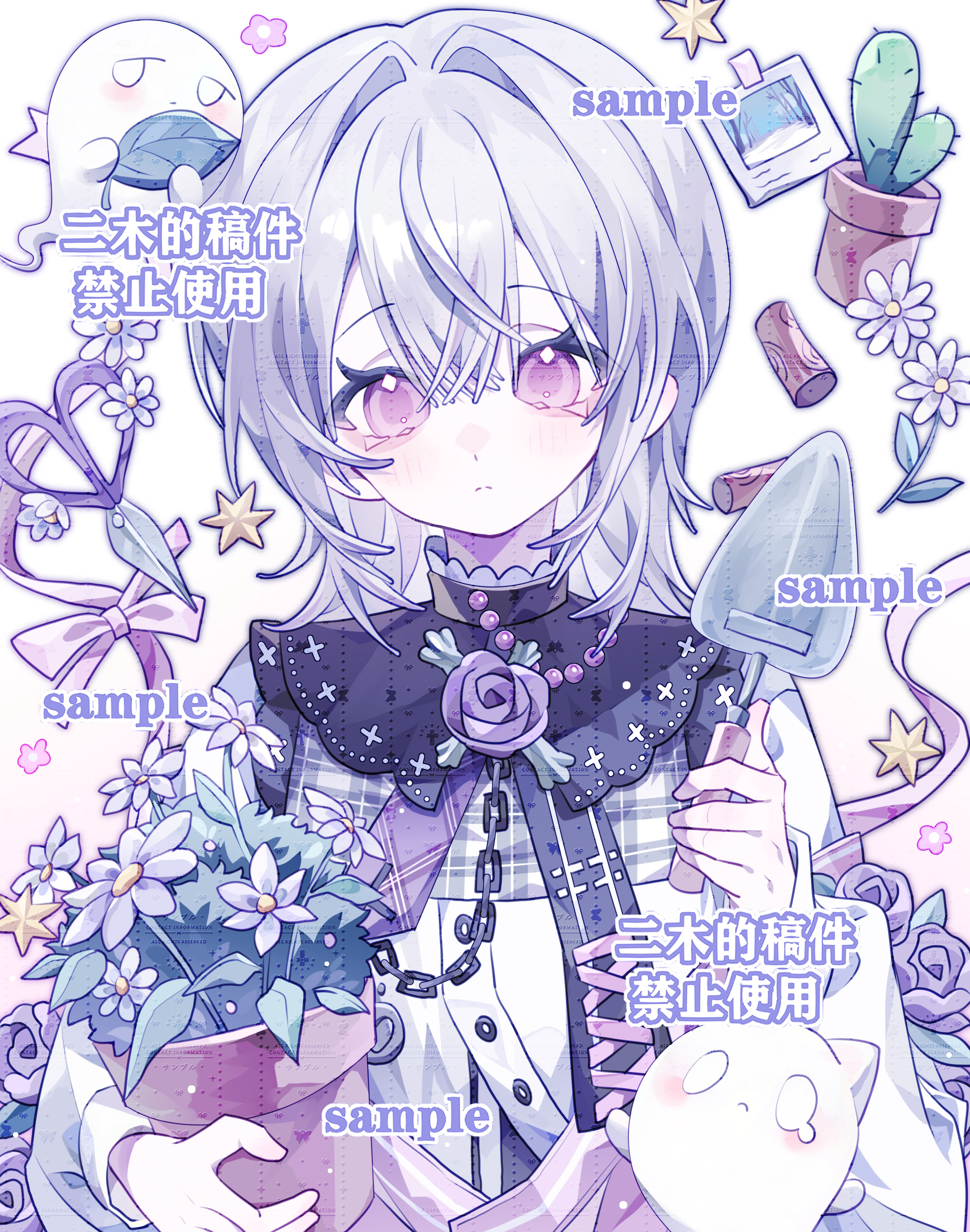 1girl 2mubudaye absurdres blush chain chinese_commentary closed_mouth collar commentary_request flower flower_pot frills ghost grey_hair hair_between_eyes highres holding leaf long_sleeves looking_at_viewer medium_hair original plant potted_plant purple_eyes purple_flower ribbon rose sample_watermark scissors shirt shovel solo upper_body watering_can watermark white_background white_flower white_shirt