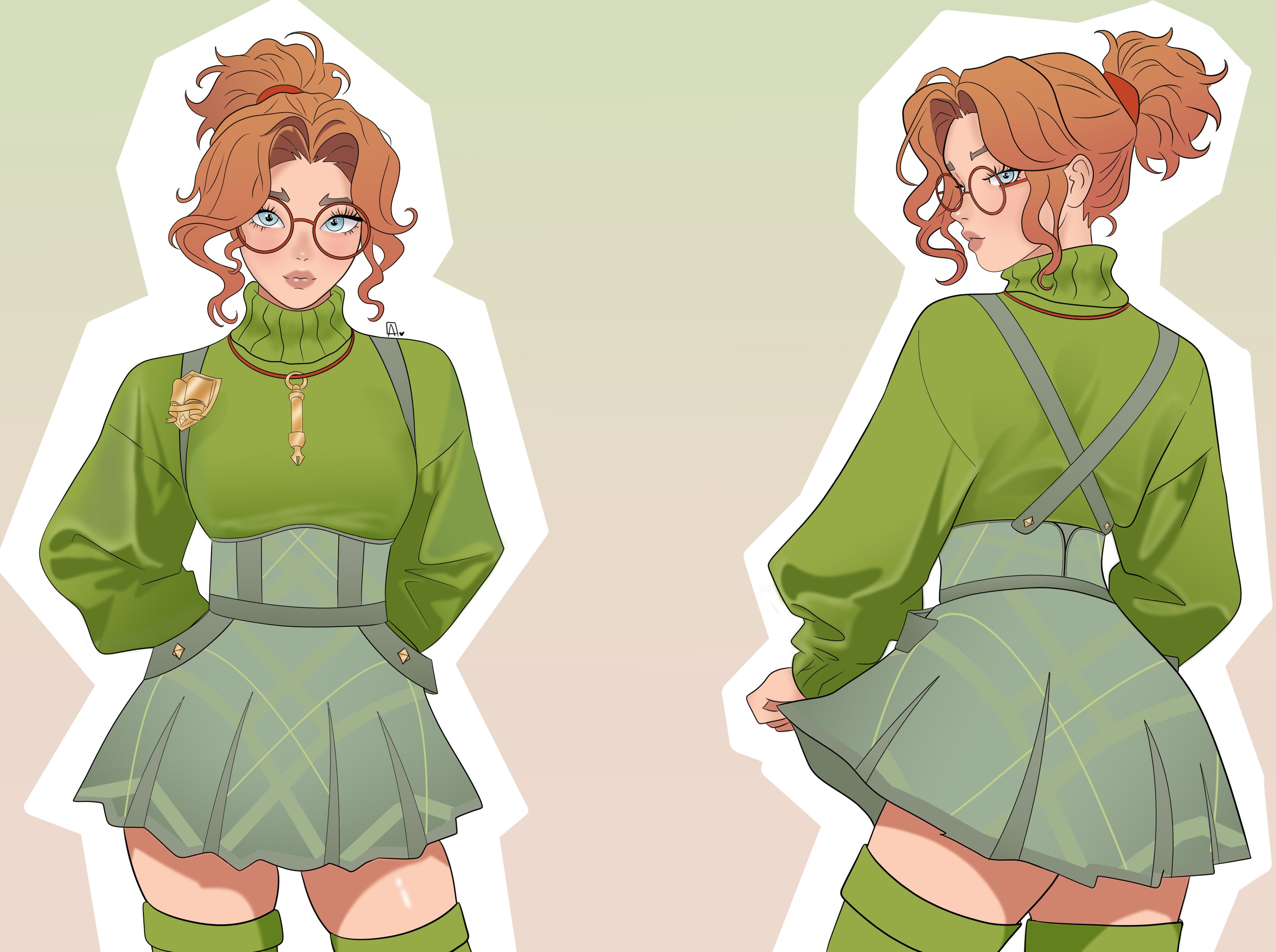 1girl absurdres anaessbae artist_logo blue_eyes clothes_lift commentary deadlock_(game) english_commentary facing_away facing_viewer glasses gradient_background green_background green_skirt green_sweater green_thighhighs hands_in_pockets high_ponytail highres jewelry lifting_own_clothes logo looking_at_viewer looking_back multiple_views necklace orange_background orange_hair outline paige_(deadlock) ponytail red-framed_eyewear round_eyewear short_ponytail skirt skirt_lift solo suspender_skirt suspenders sweater thighhighs thighs turtleneck turtleneck_sweater wavy_hair white_outline zettai_ryouiki